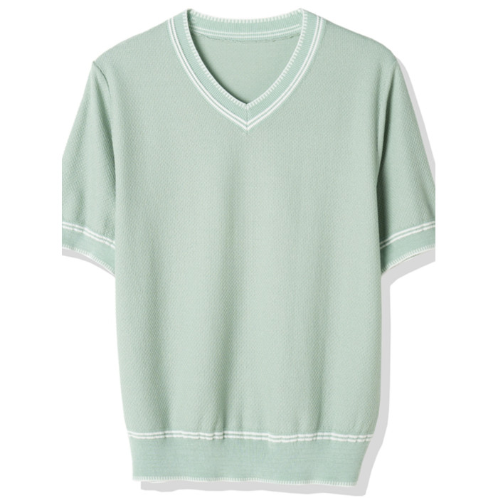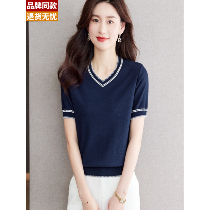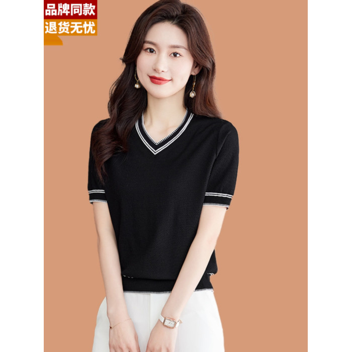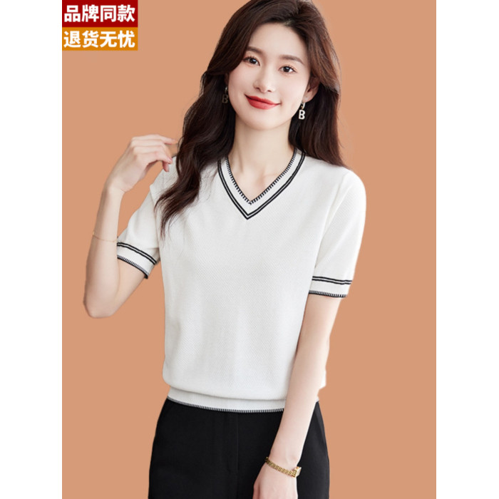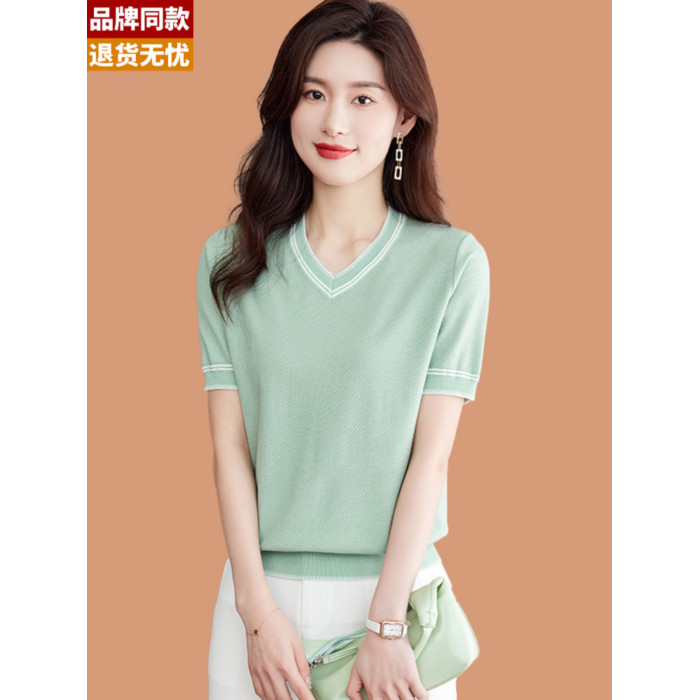 冰絲短袖女T恤2025新款夏季體恤V領針織衫中袖配裙子天絲上衣