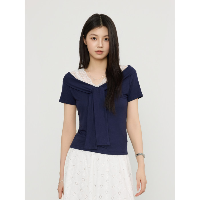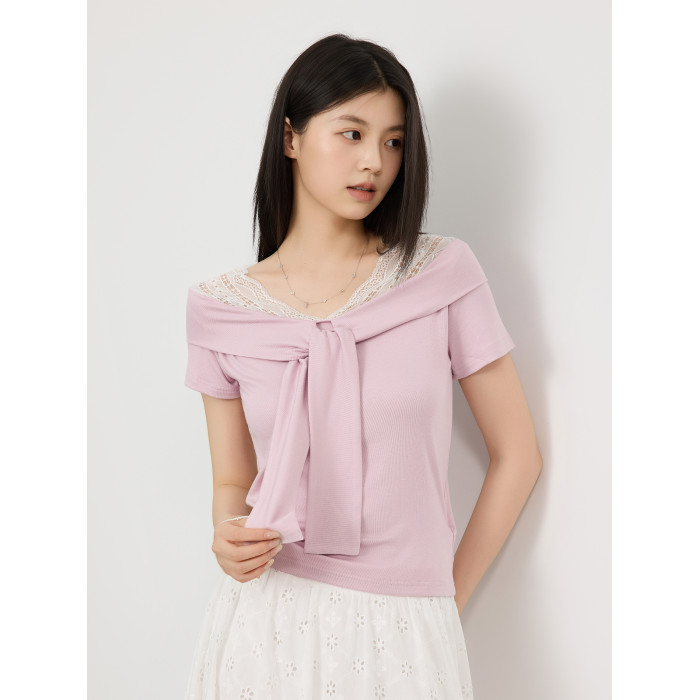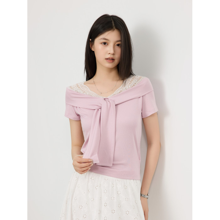 韓版夏季新款溫柔氣質蕾絲拼接系帶收腰顯瘦短袖女T恤純色上衣潮