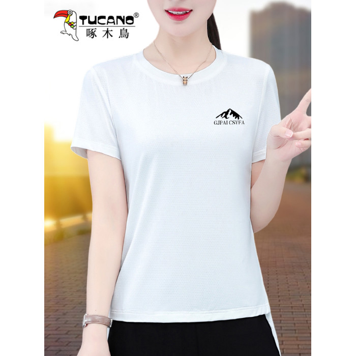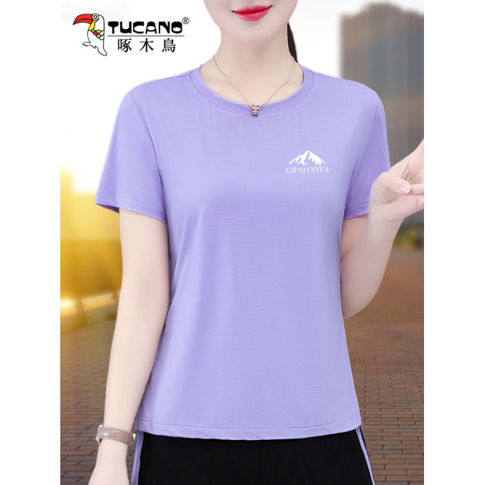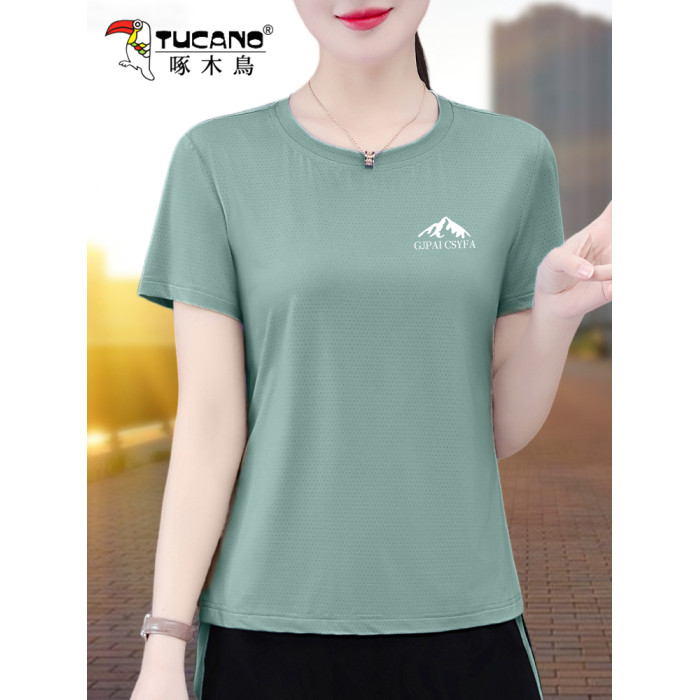 啄木鳥冰絲速乾短袖女t恤2025新款夏季中年媽媽寬松大碼運動上衣
