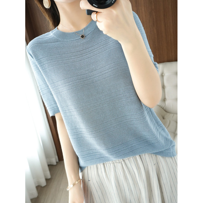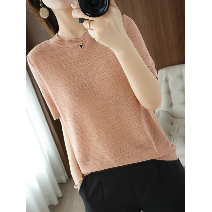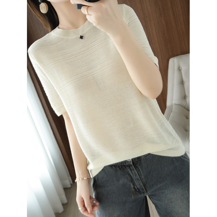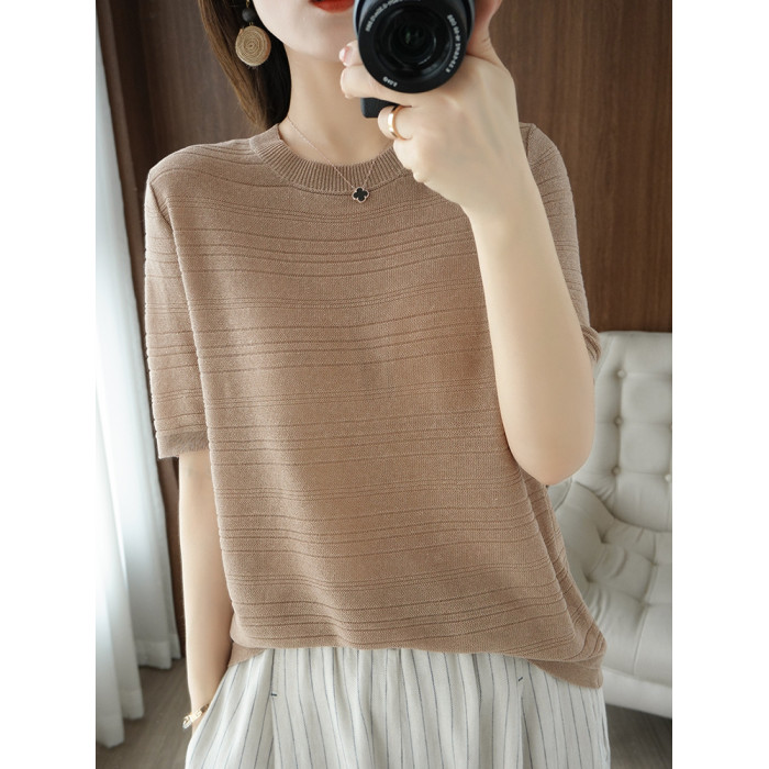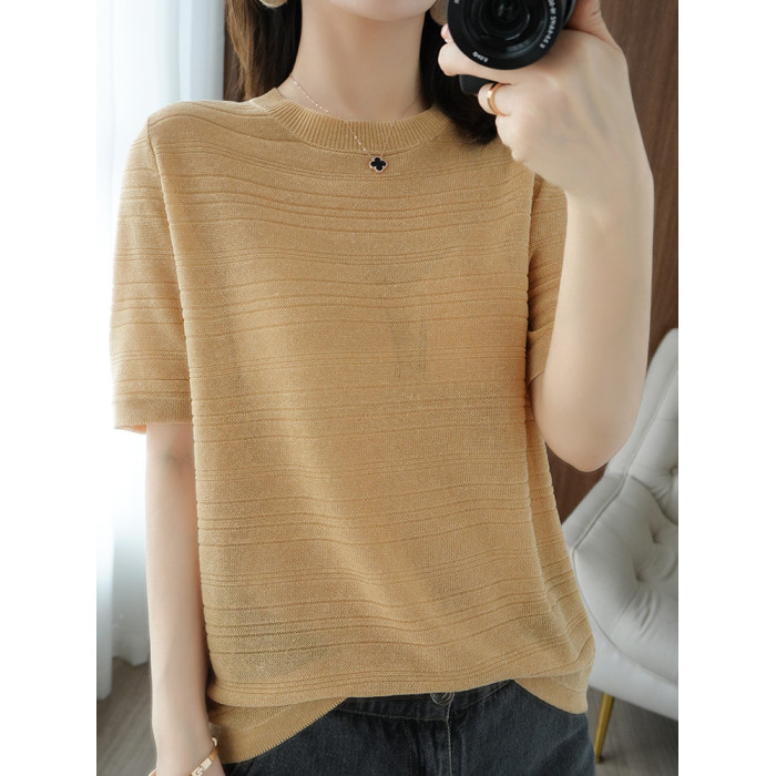 夏季新款棉麻針織短袖女t恤寬松圓領打底上衣薄款百搭顯瘦氣質線