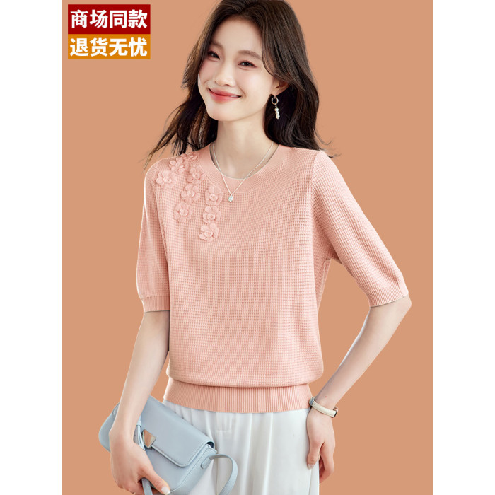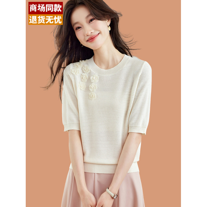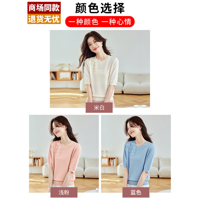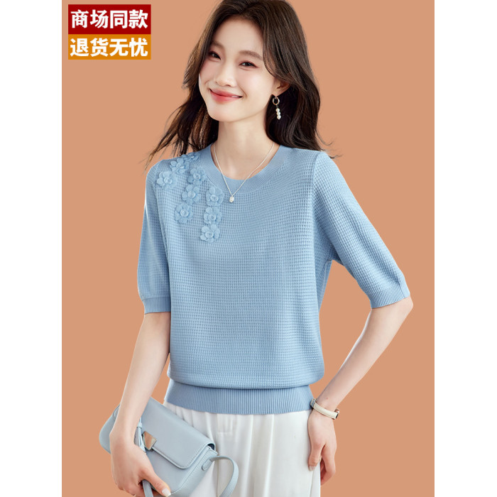 桑蠶絲冰絲短袖女t恤2025新款淺藍色花朵針織衫小香風上衣配裙子