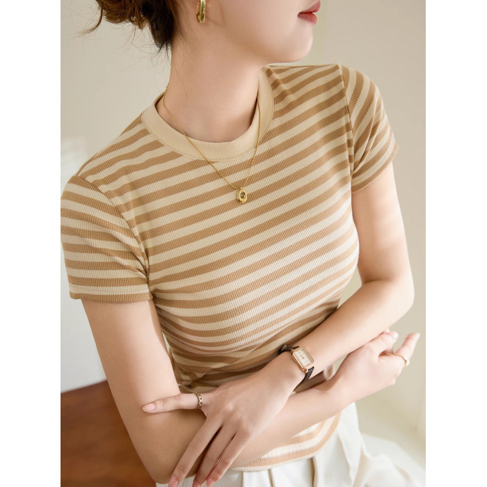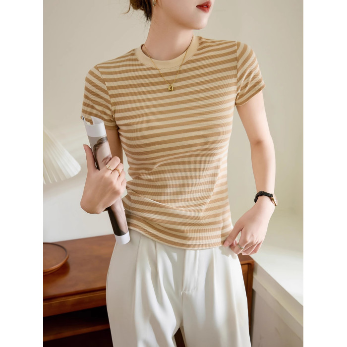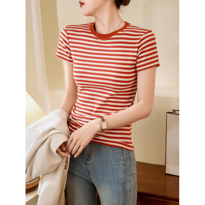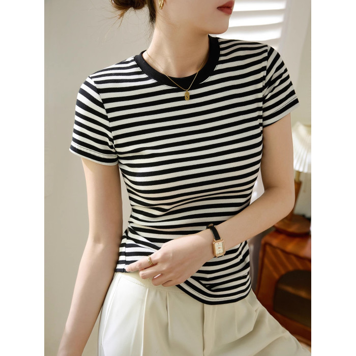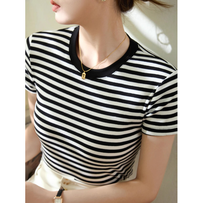 修身螺紋短袖黑白橫條紋顯瘦正肩女t恤夏季棉別致小圓領收腰上衣