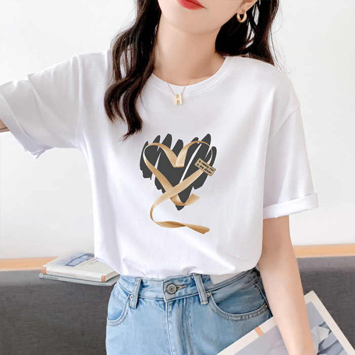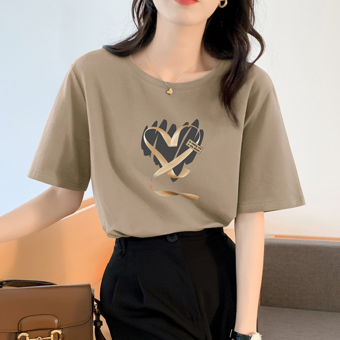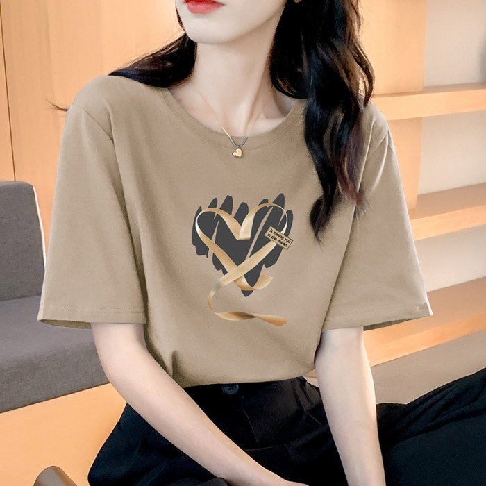 卡其色純棉女t恤短袖寬松潮牌女設計感印花大碼女裝夏季新款上衣