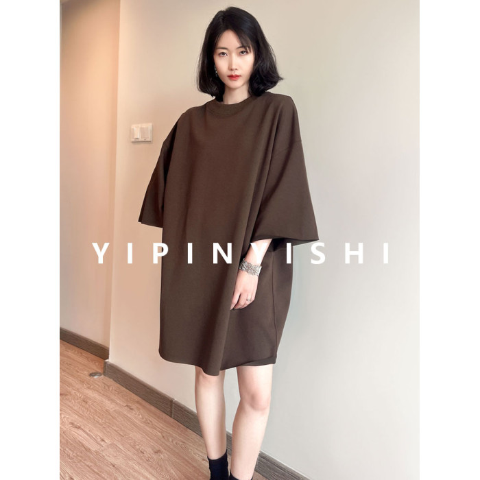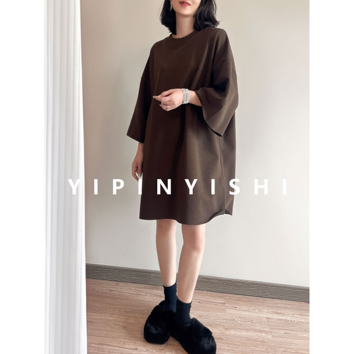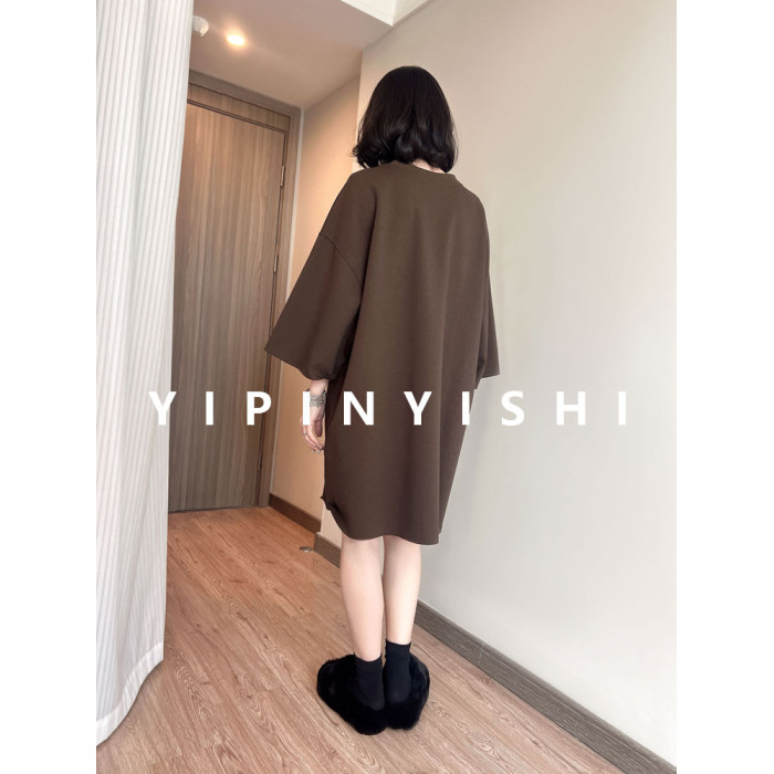 2025夏季咖色圓領寬松中袖t恤衛衣連衣裙女歐貨大版中長款上衣潮