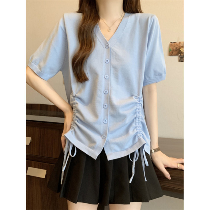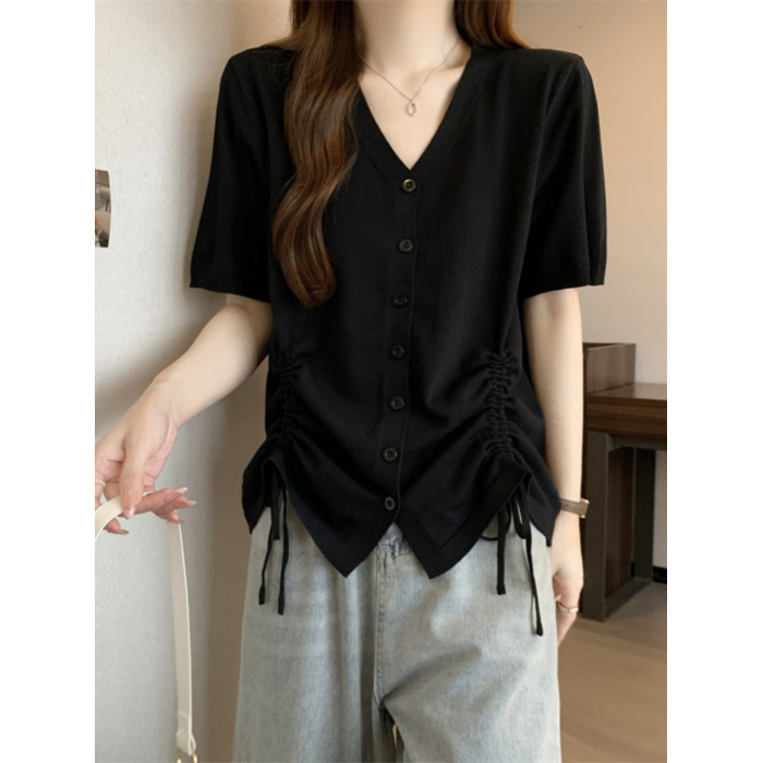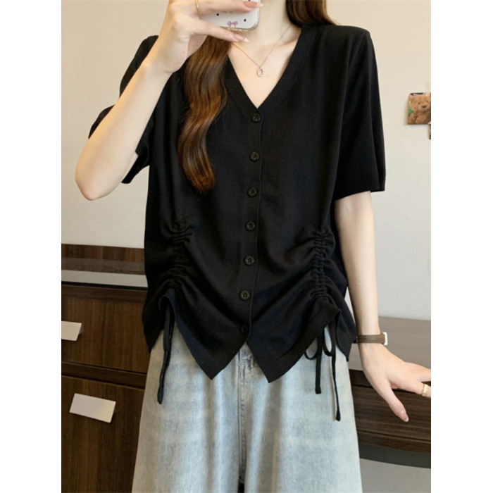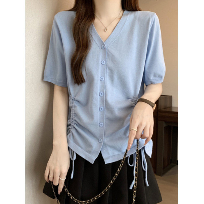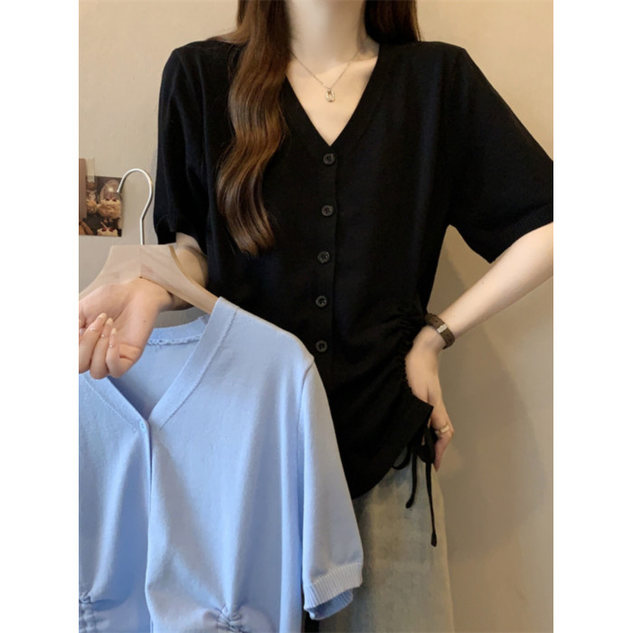 胖mm設計感顯瘦v領抽繩冰絲短袖女t恤夏季大碼減齡正肩上衣打底衫