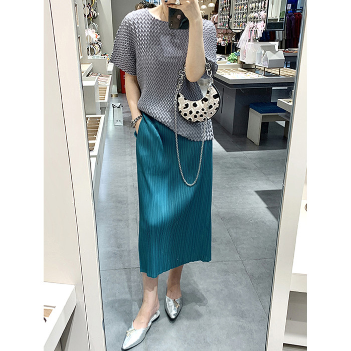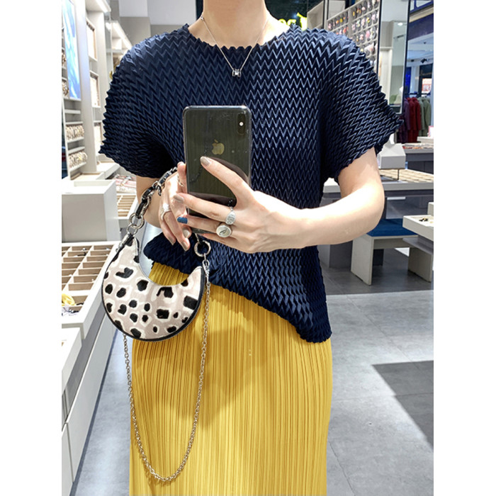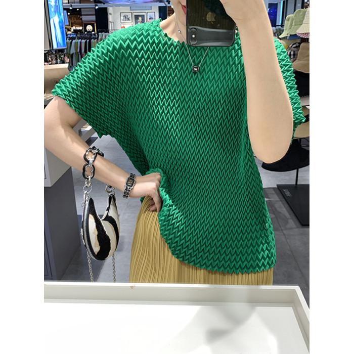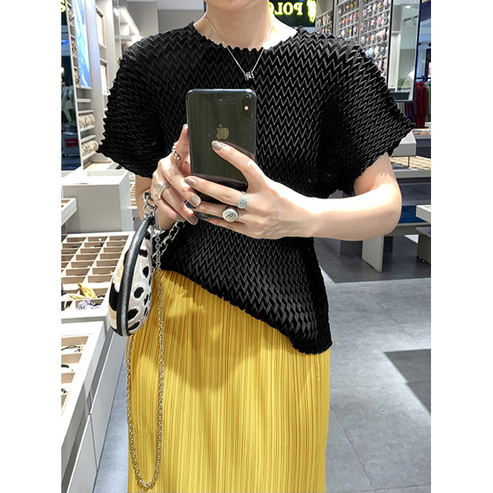 三宅褶皺2025夏季新品遮肚子顯瘦圓領上衣獨特超好看短袖女T恤薄