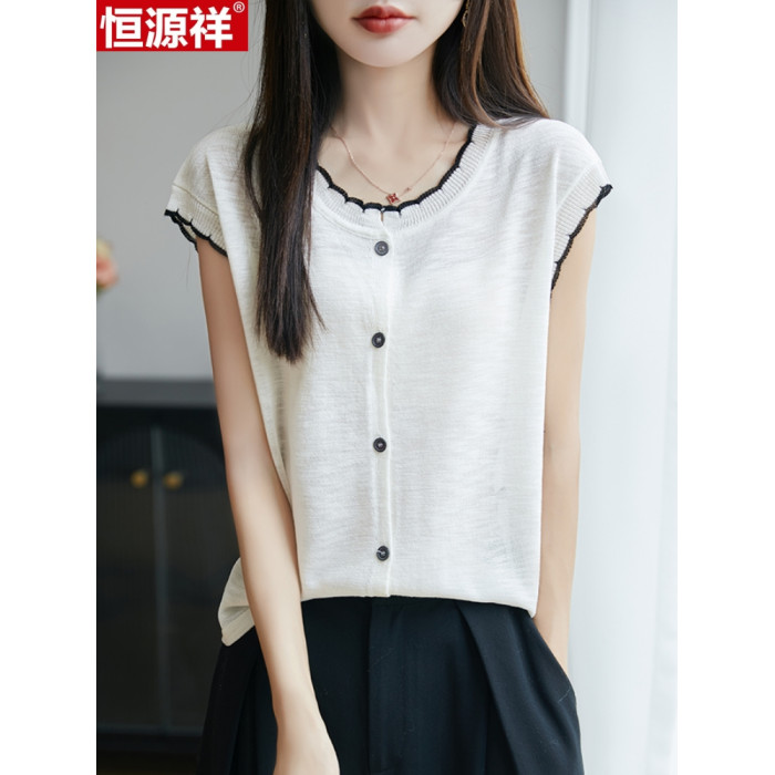 恒源祥桑蠶絲短袖女T恤夏季新款寬松圓領針織衫開衫拼色真絲短袖