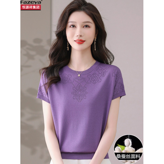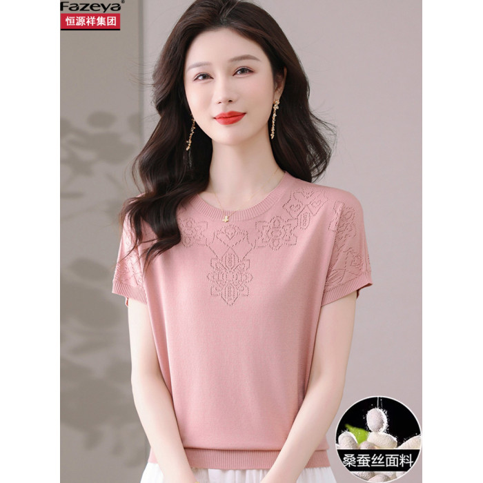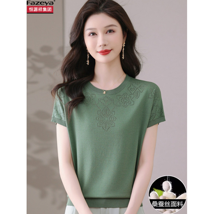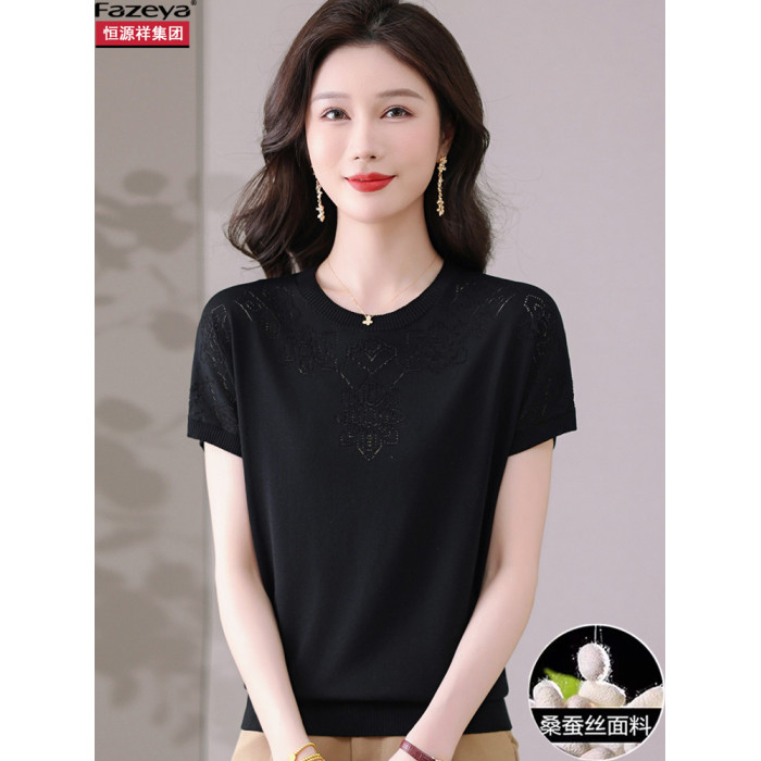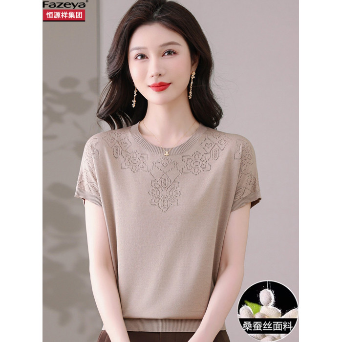 桑蠶絲圓領短袖女t恤2025新款夏季薄款媽媽正肩上衣冰絲針織衫T恤