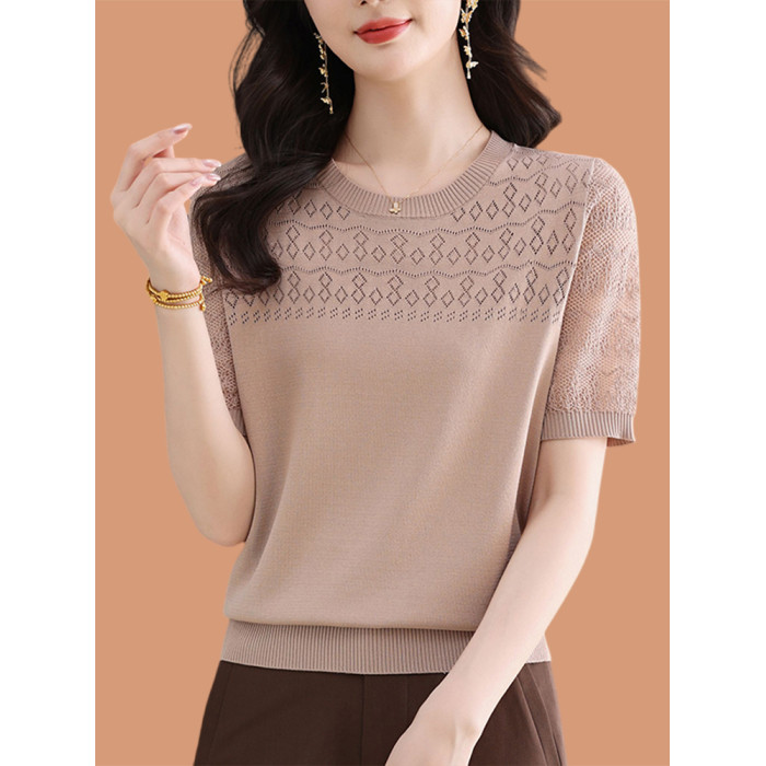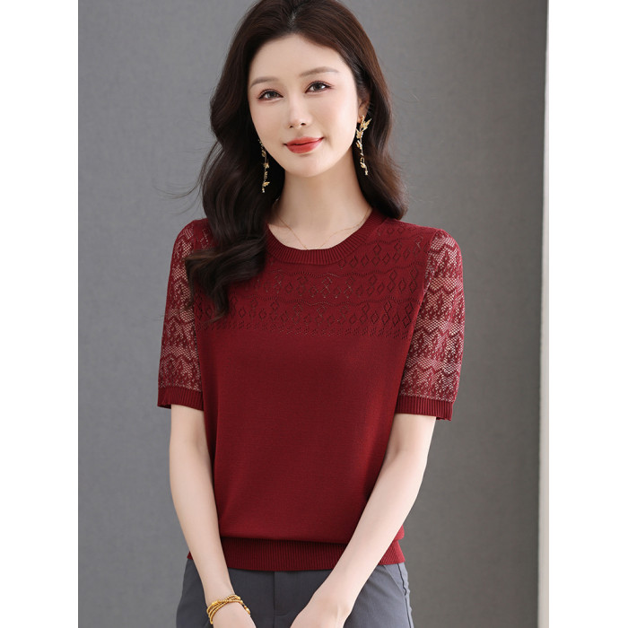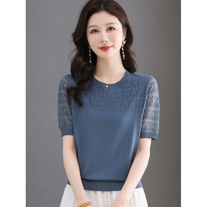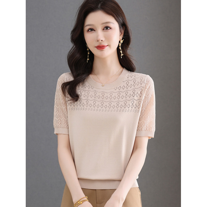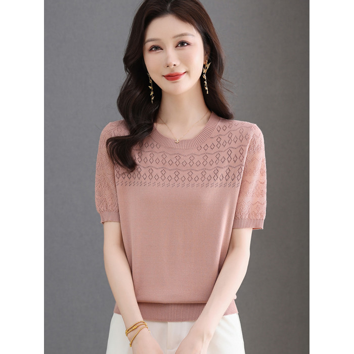 鄂爾多斯市桑蠶絲短袖女T恤顯瘦圓領薄款針織打底衫洋氣冰絲上衣