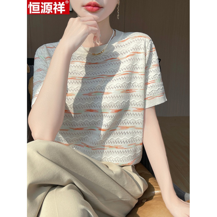 恒源祥桑蠶絲短袖女T恤夏季新款寬松圓領針織衫上衣條紋百搭真絲