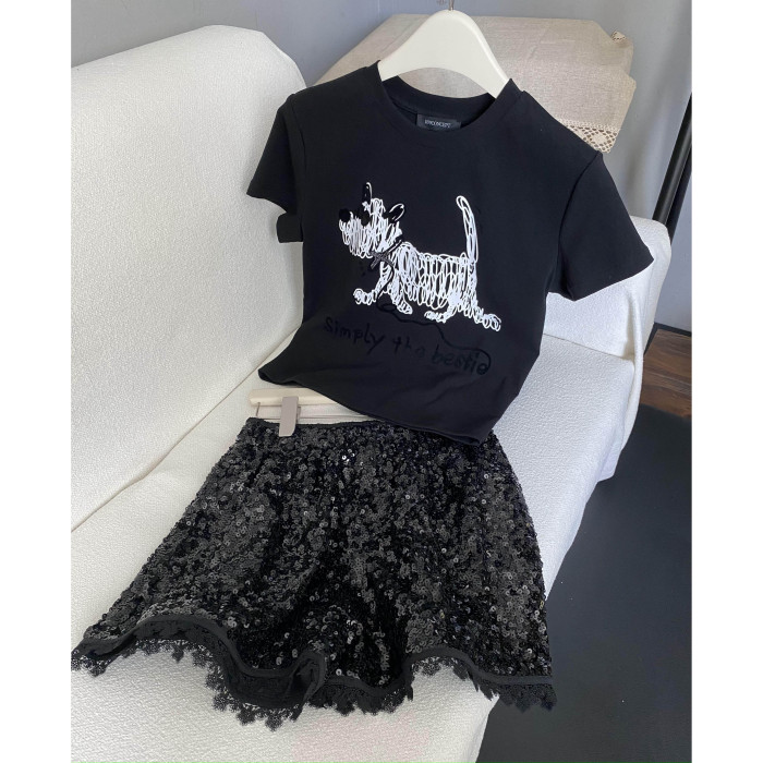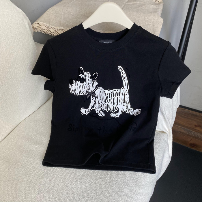 歐貨2025夏季新款圓領短袖拼色蝴蝶結小狗植絨線條短款修身女T恤