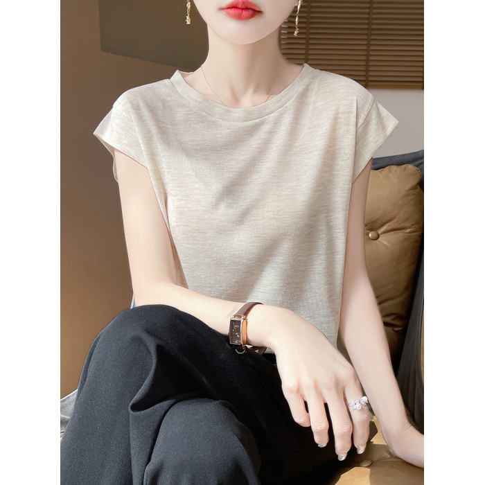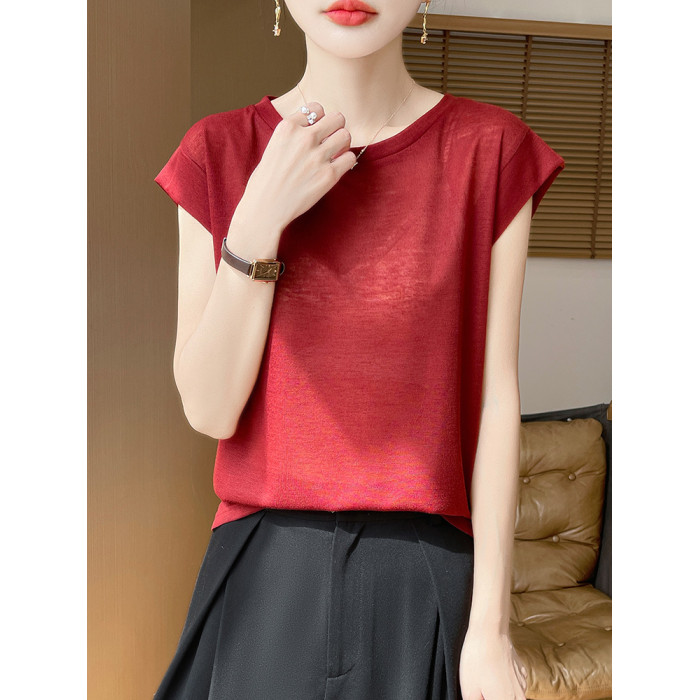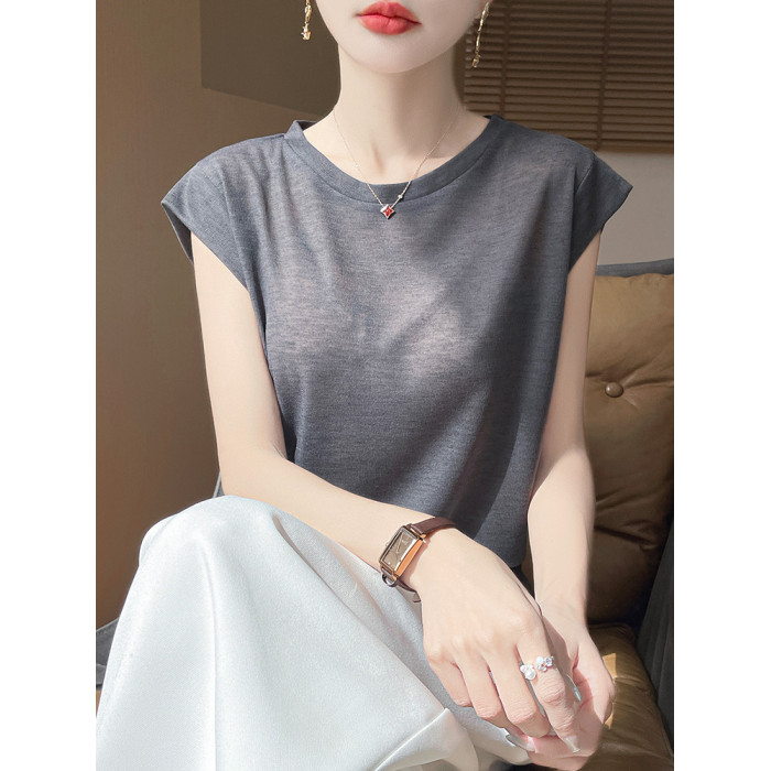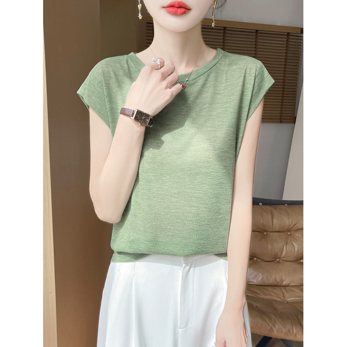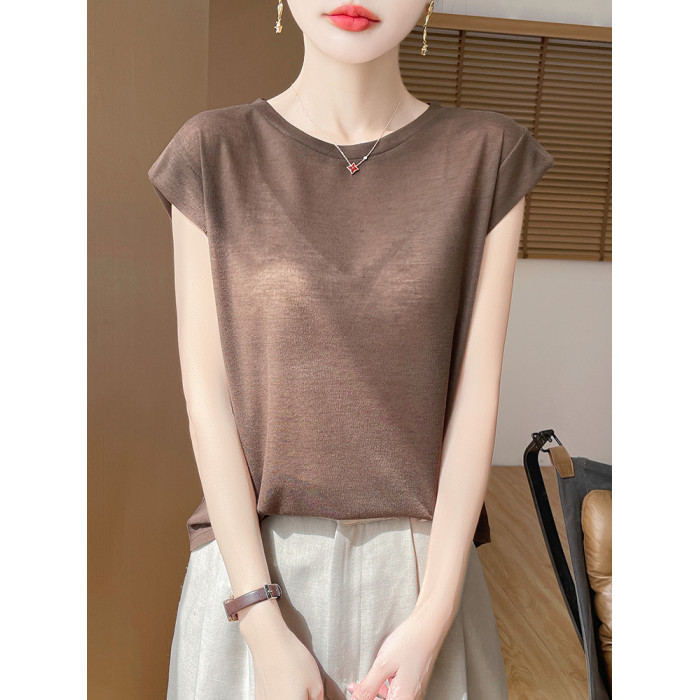 夏季圓領薄微透天絲萊賽爾針織短袖女T恤飛飛袖高級感T恤背心上衣