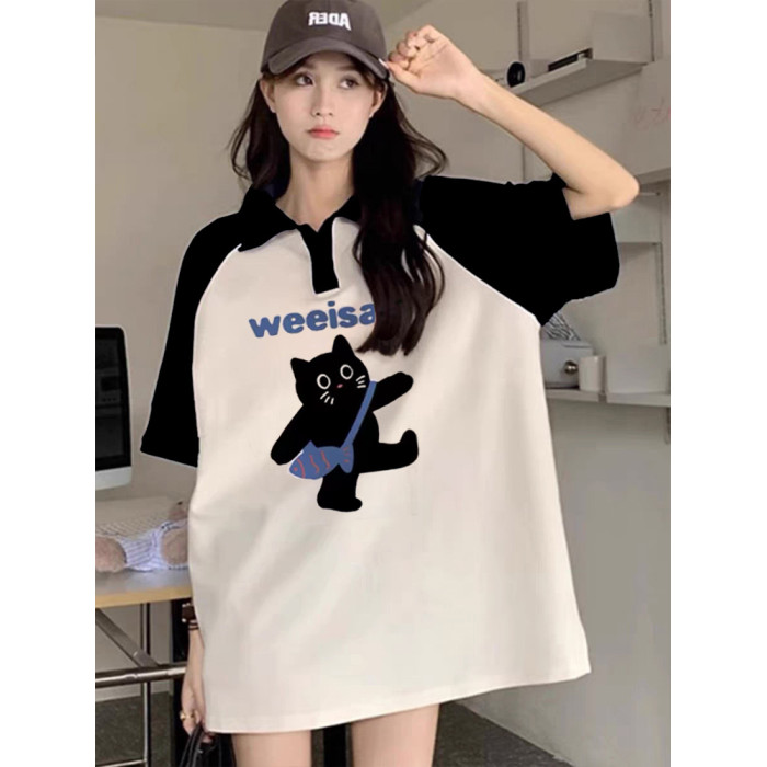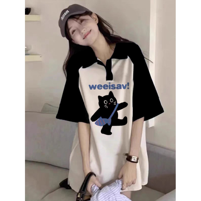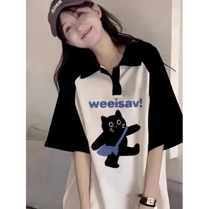 巨好看小貓polo衫短袖女t恤夏2025寬松韓版慵懶風半袖初中生上衣