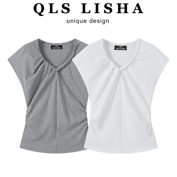 巧麗莎小衆設計v領女t恤背心2025新款修身顯瘦夏日通勤漂亮小上衣