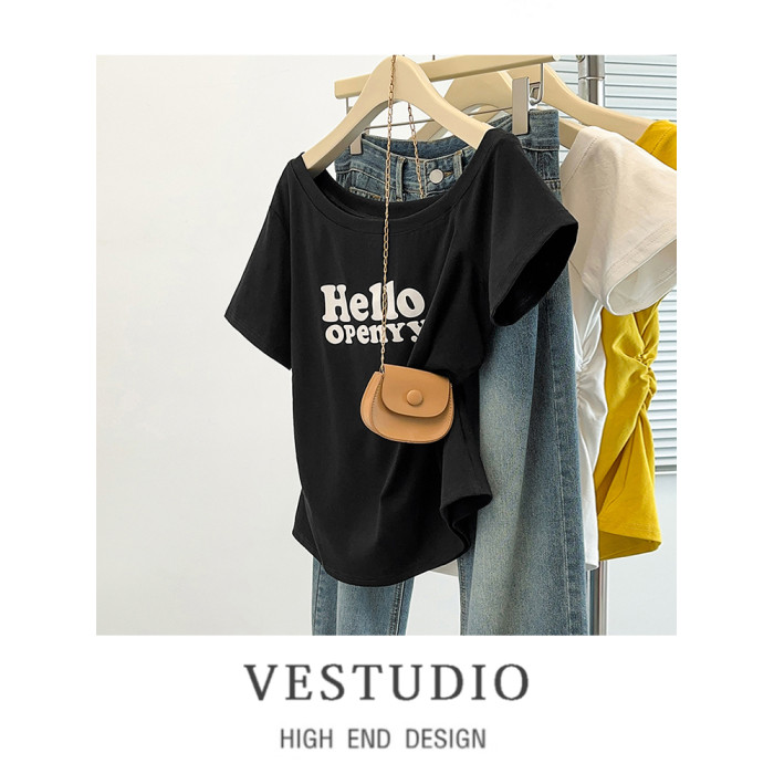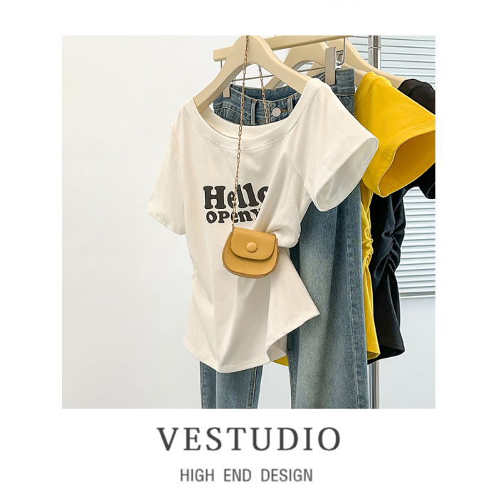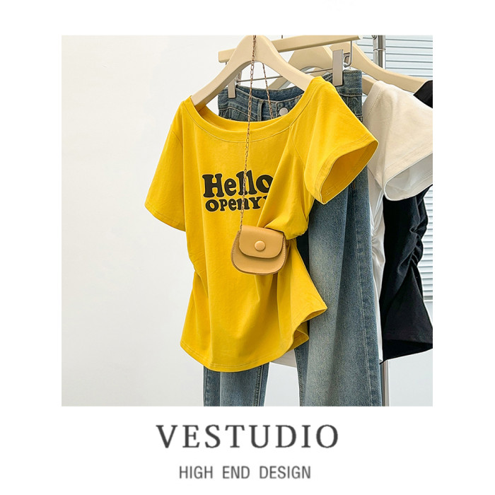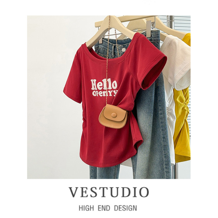 品牌折釦夏季設計感辣妹收腰褶皺上衣胖mm大碼露肩顯瘦短袖女T恤