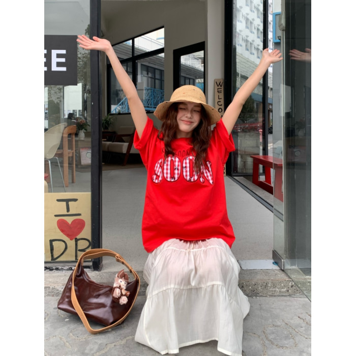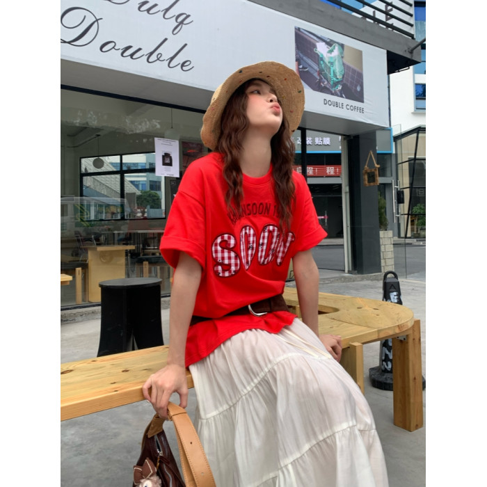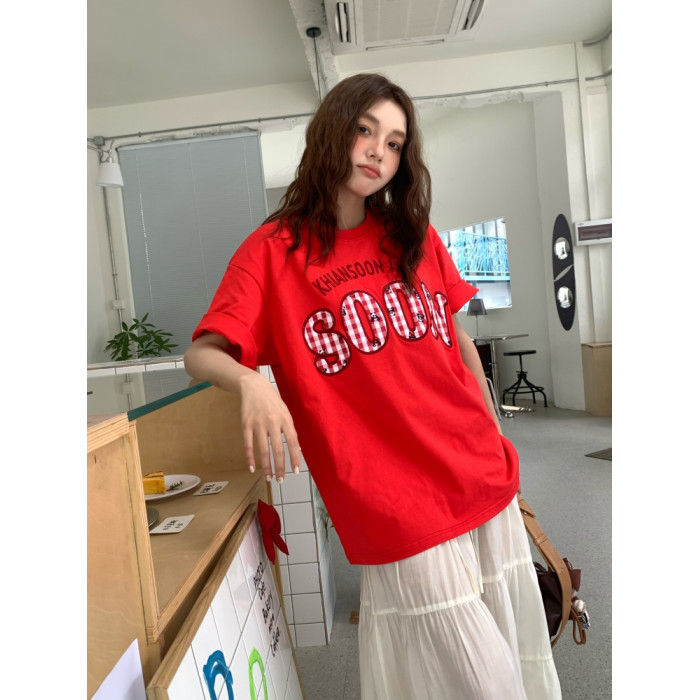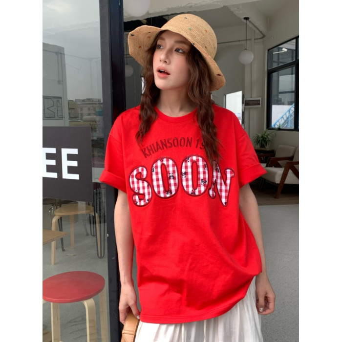 KHIAN SOON夏季國潮牌美式熊貓貼布綉字母寬松套頭純棉短袖女T恤