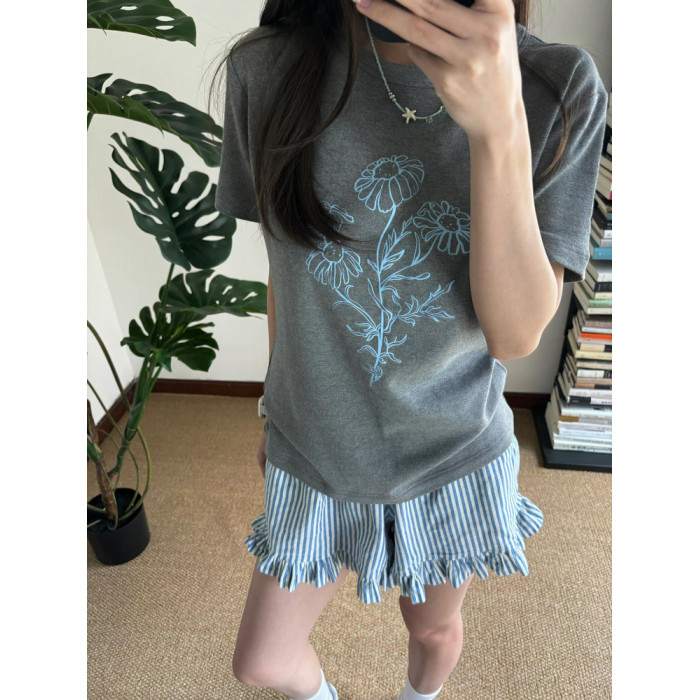 韓版衣服圓領印花短袖女T恤2025新款夏寬松慵懶半袖氣質百搭上衣