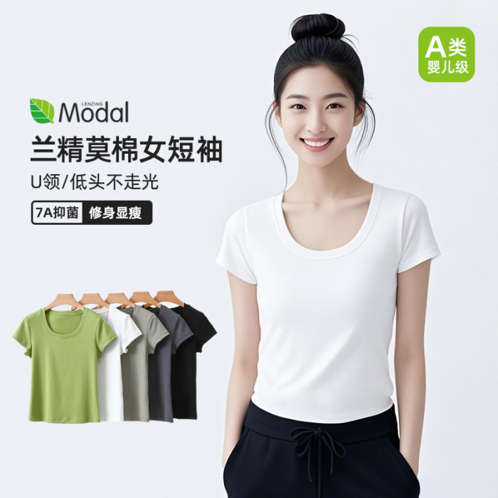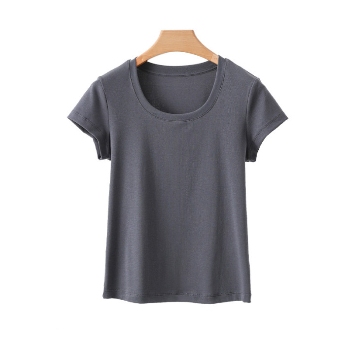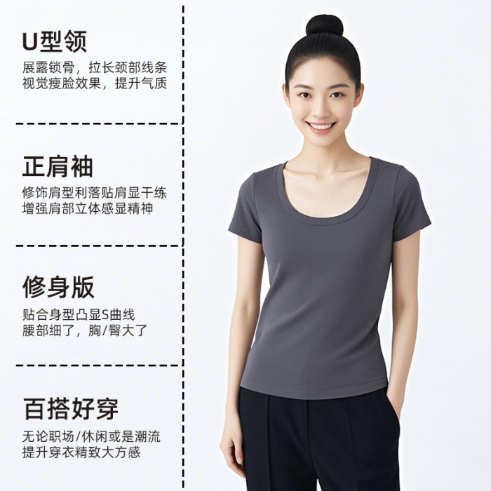 韓版東大門U領正肩短袖女t恤a類莫棉涼感修身女士夏季上衣高級感