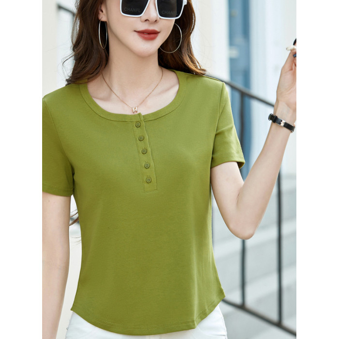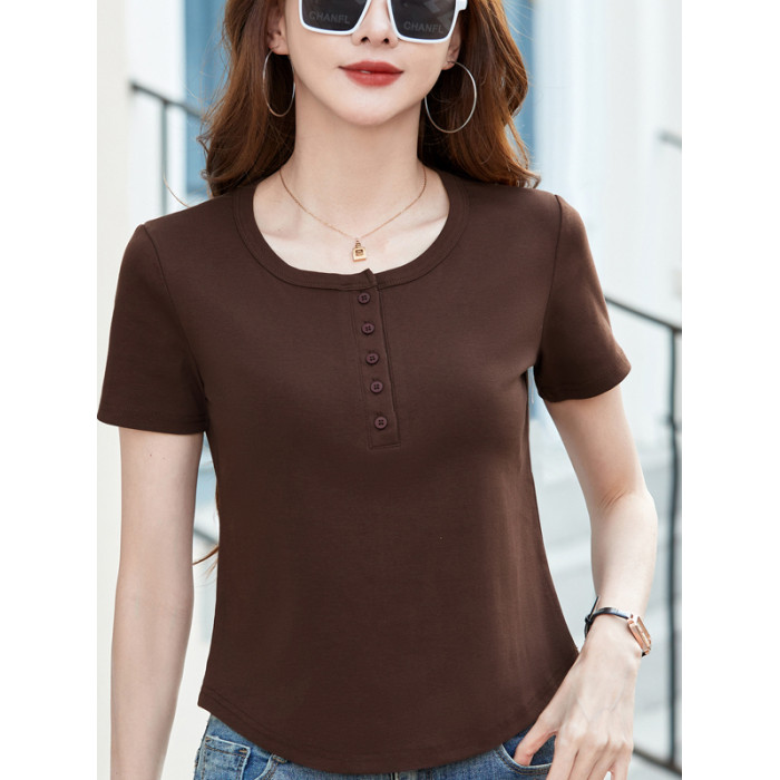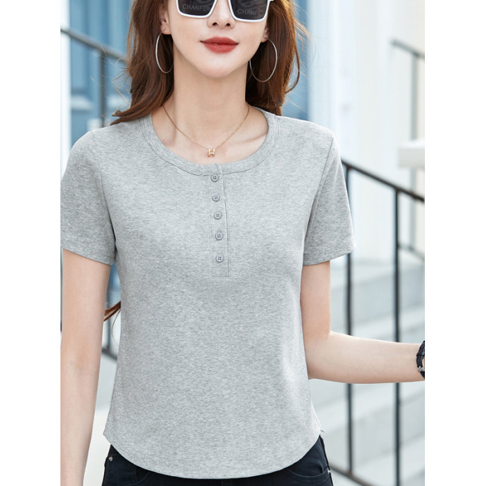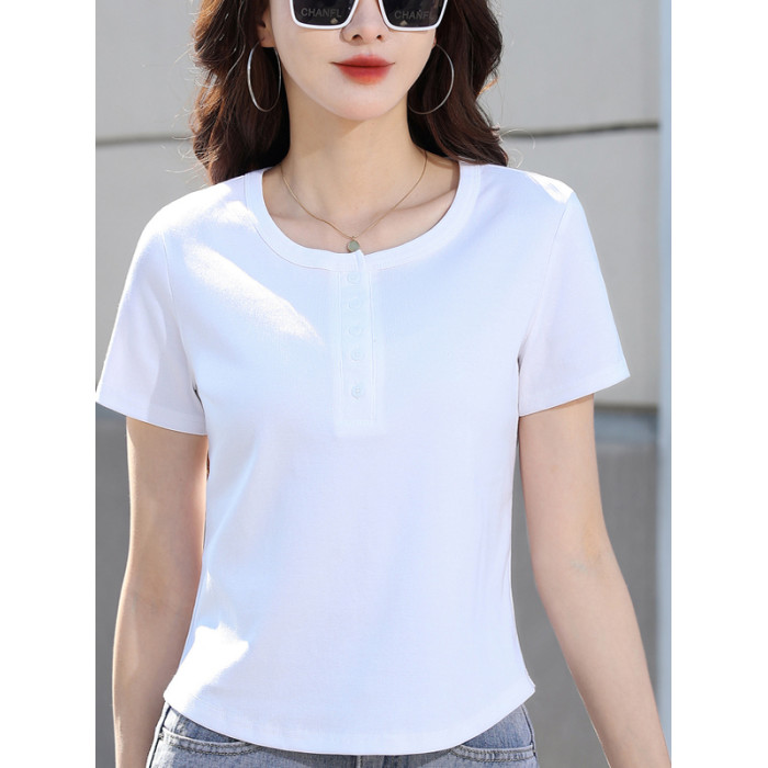 2025短款新款純棉短袖女T恤純色圓領紐釦上衣韓版時尚大碼打底衫