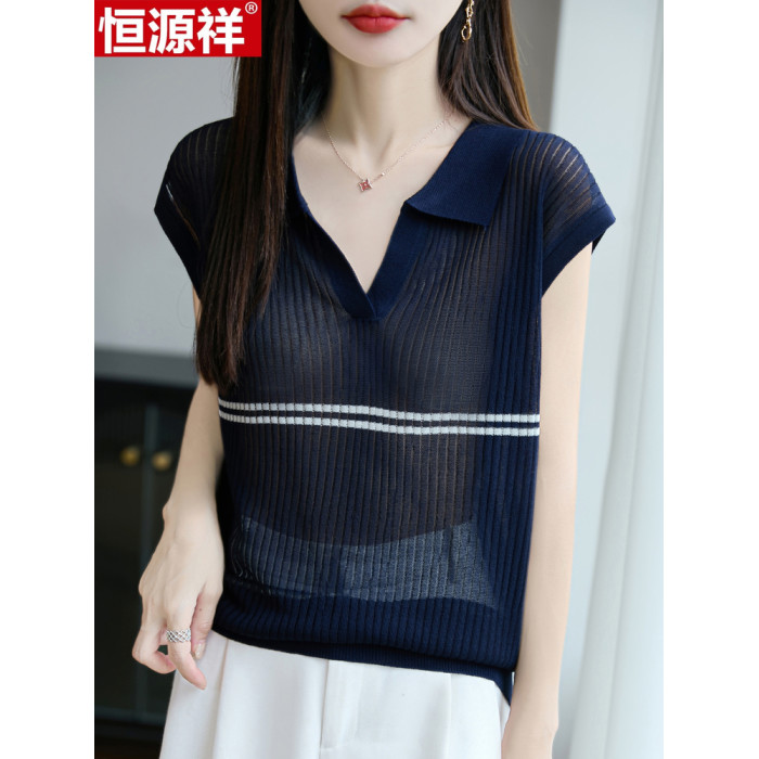 恒源祥純桑蠶絲短袖女T恤夏季新款寬松翻領針織上衣時尚拼色真絲