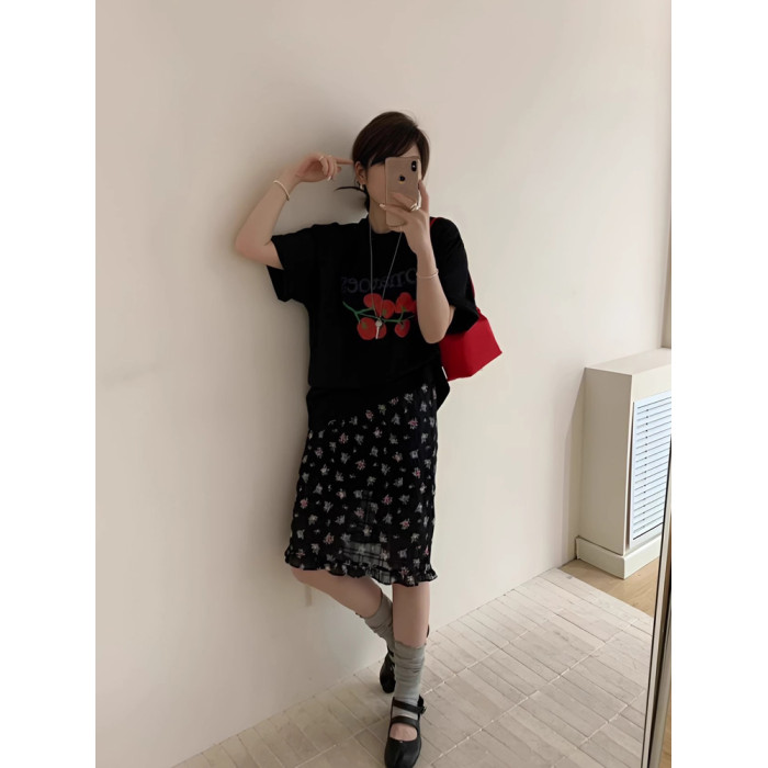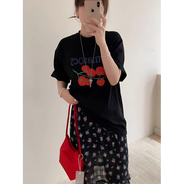 韓版簡約印花短袖女T恤新款夏季小衆設計感休閒百搭黑色顯瘦上衣