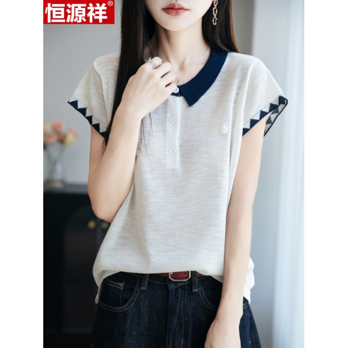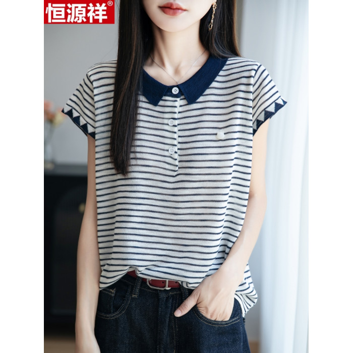 恒源祥純桑蠶絲短袖女T恤夏季新款寬松娃娃領針織上衣條紋真絲
