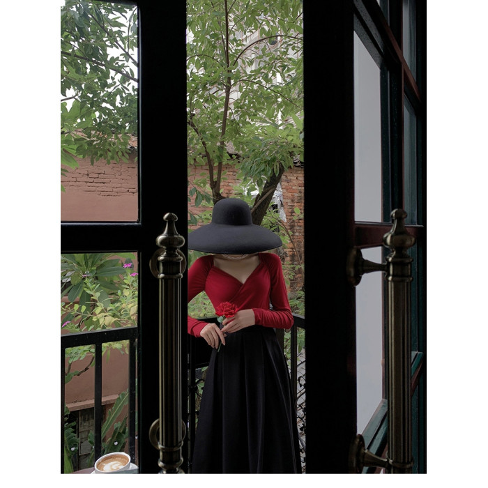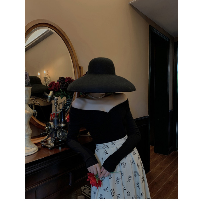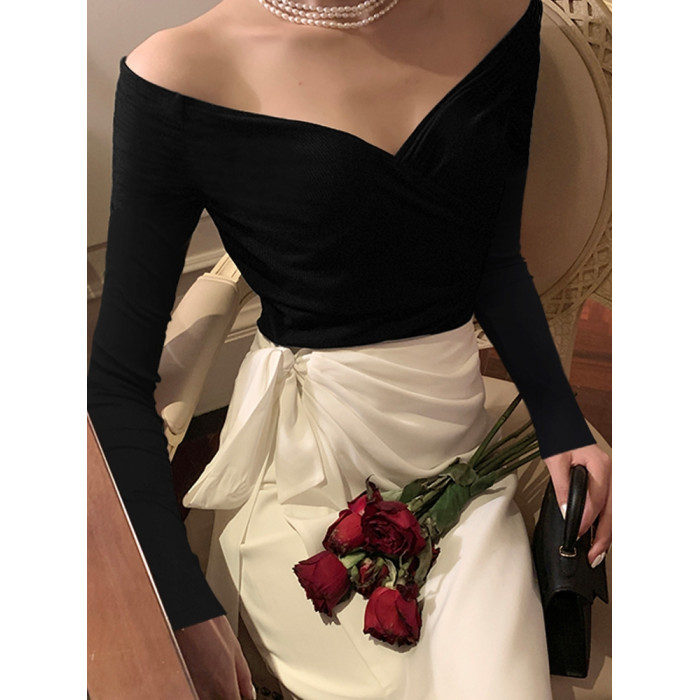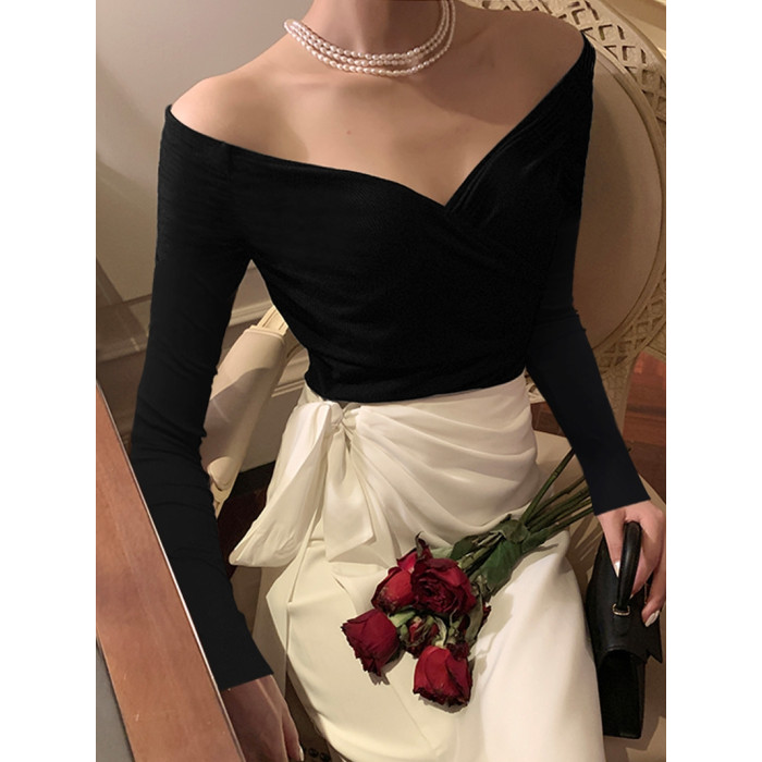 2025春秋季露肩黑色長袖女T恤一字肩性感V領修身一字領上衣打底衫