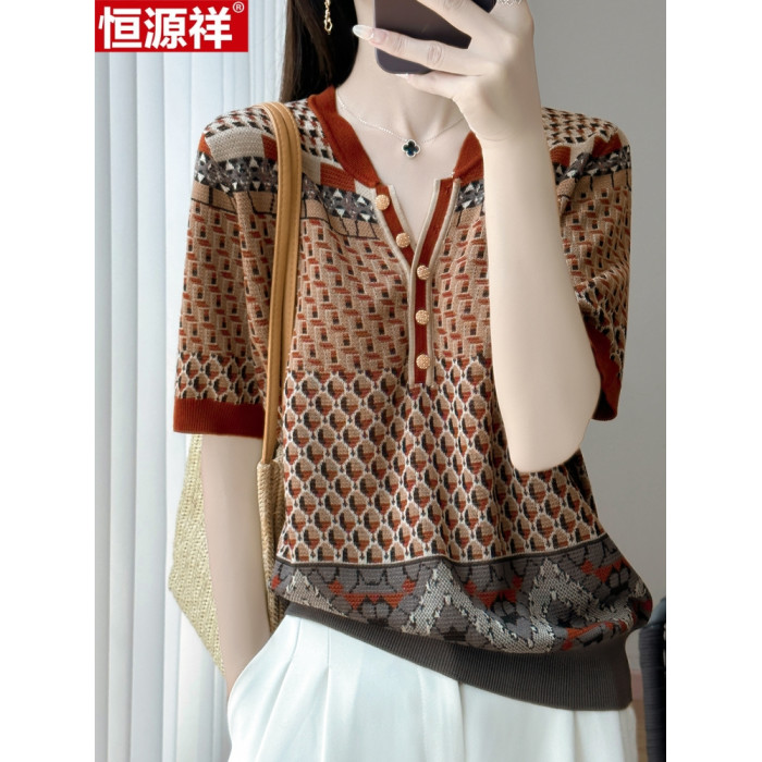 恒源祥桑蠶絲短袖女T恤夏季新款寬松V領薄款針織衫上衣時尚真絲