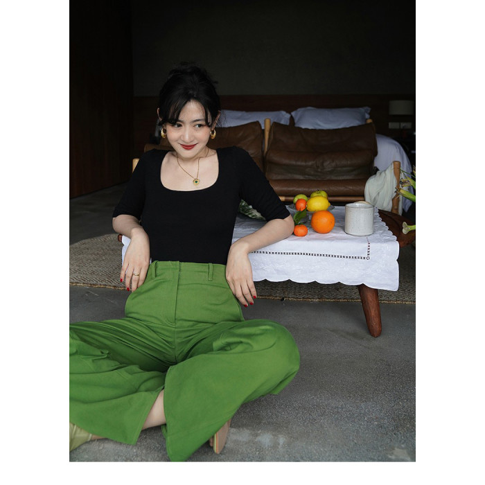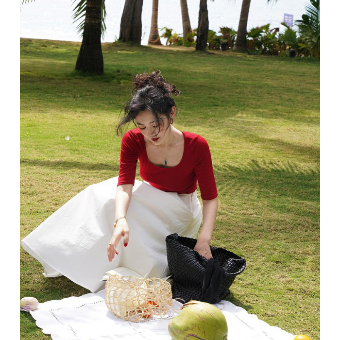 法式復古U領中袖女T恤2025春夏修身顯瘦大圓領打底衫上衣酒紅色