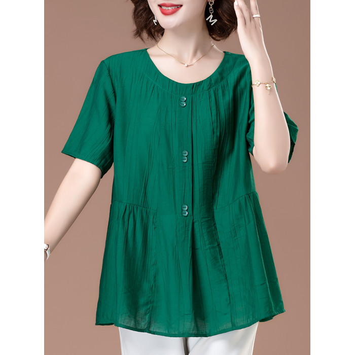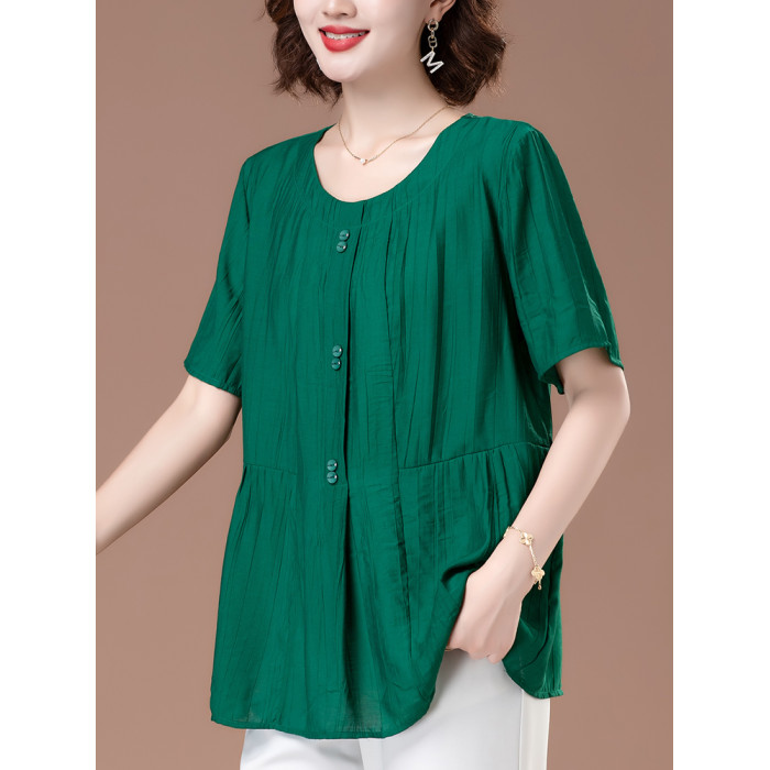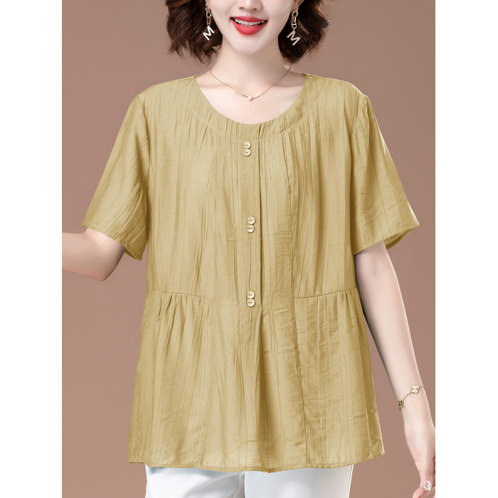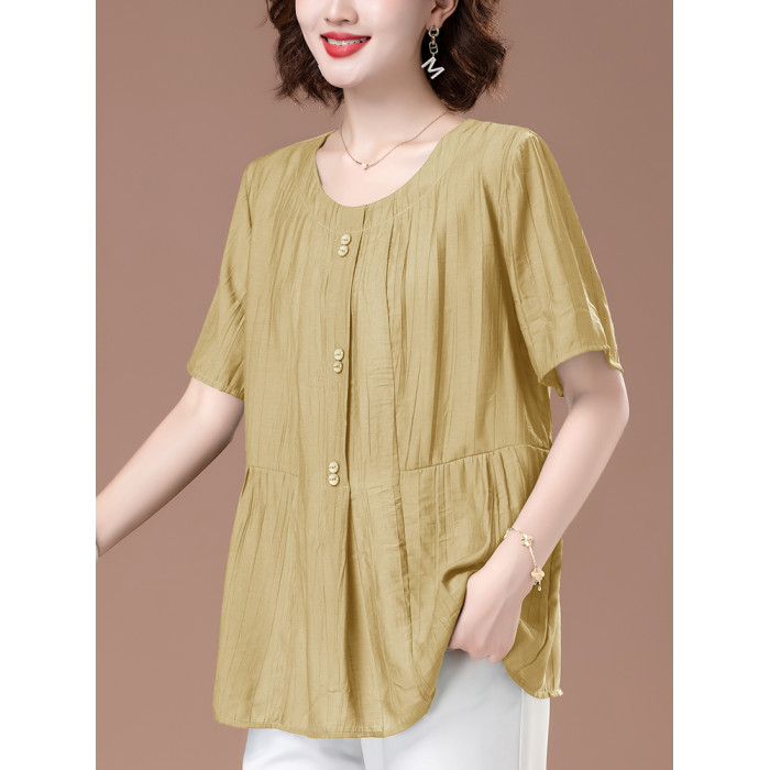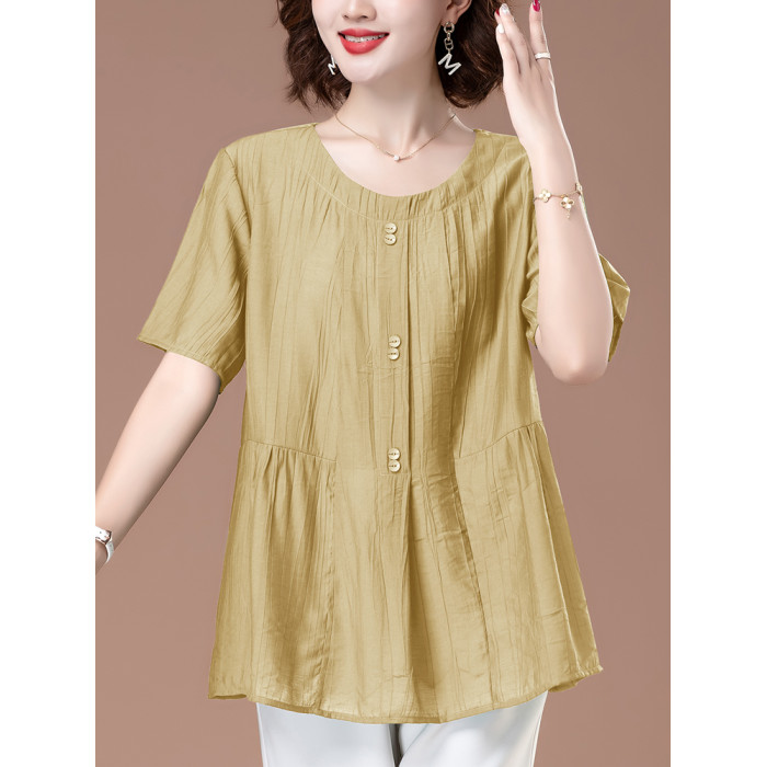 中老年媽媽棉麻短袖襯衫夏裝新款寬松大碼氣質上衣收腰遮肚女T恤