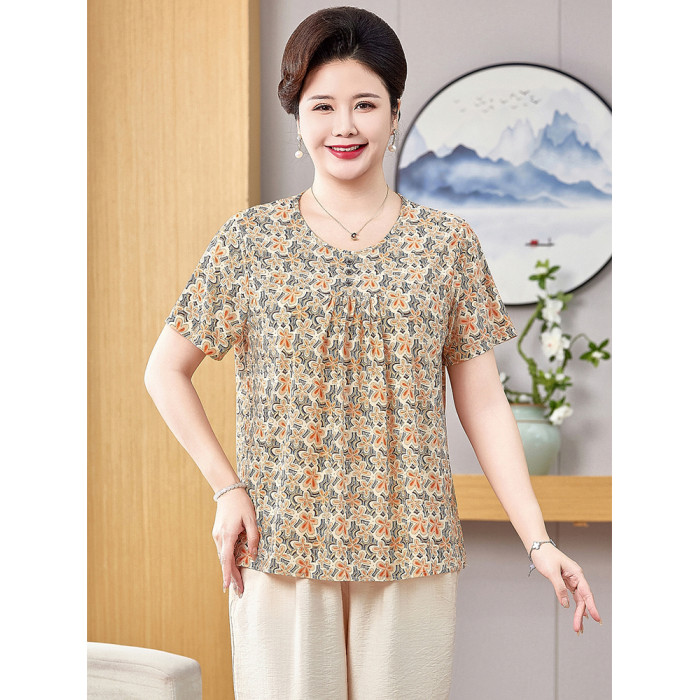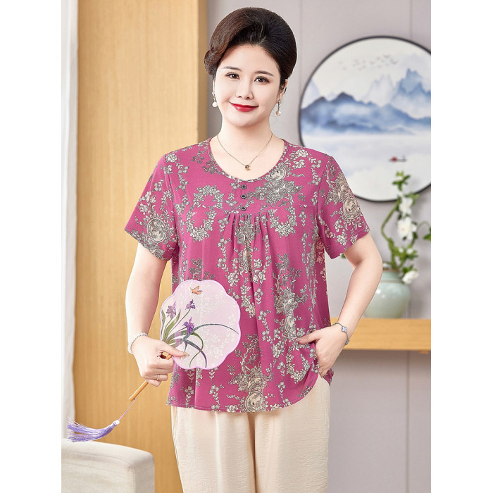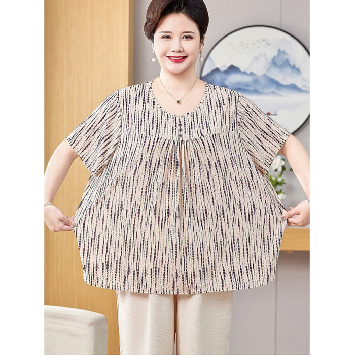 胖奶奶夏裝大碼短袖媽媽遮肚上衣中老年人女T恤老太太冰絲套裝薄