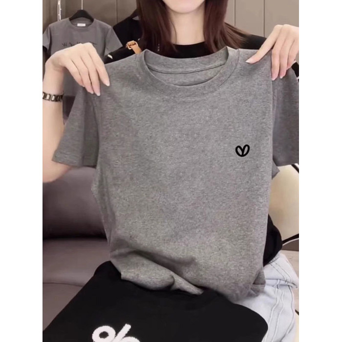 灰色正肩短袖女T恤2025新款爆款歐貨設計感印花體恤大碼寬松上衣