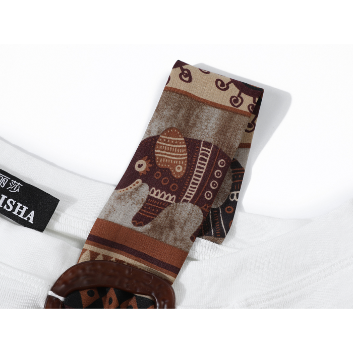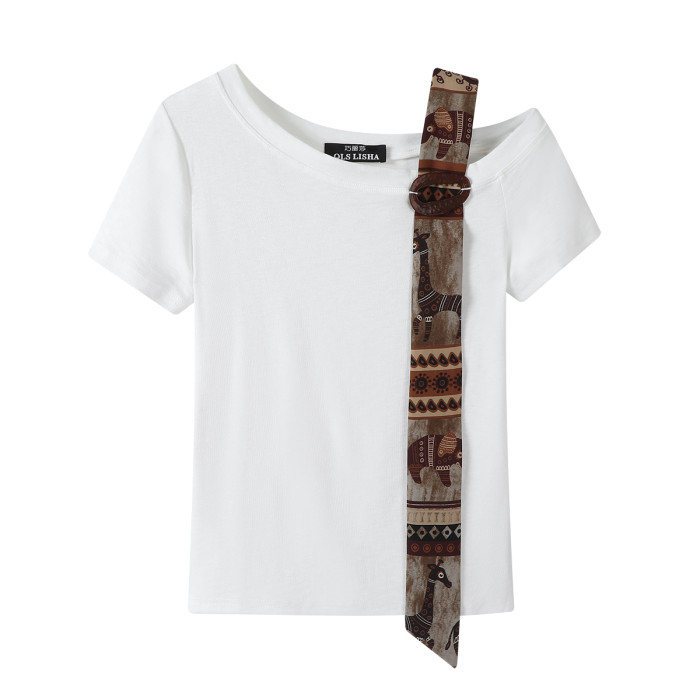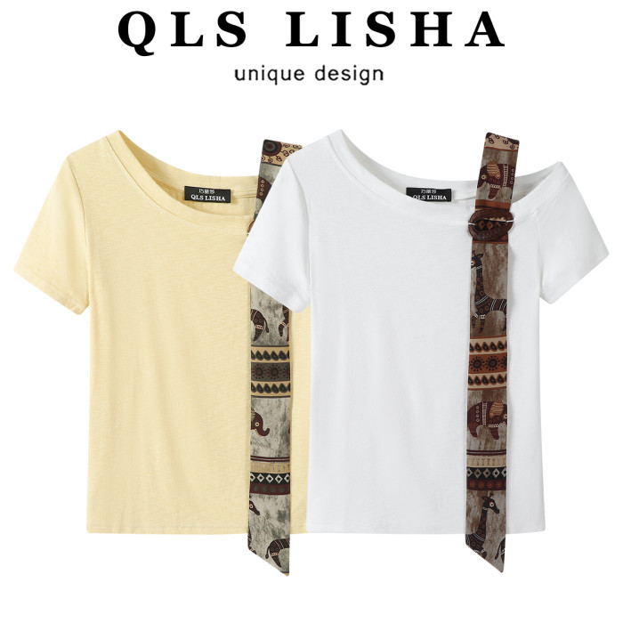 巧麗莎 韓系獨特絕美小上衣2025超火減齡設計感飄帶斜肩短袖女t恤