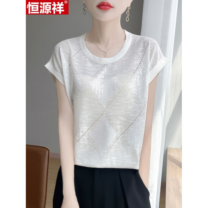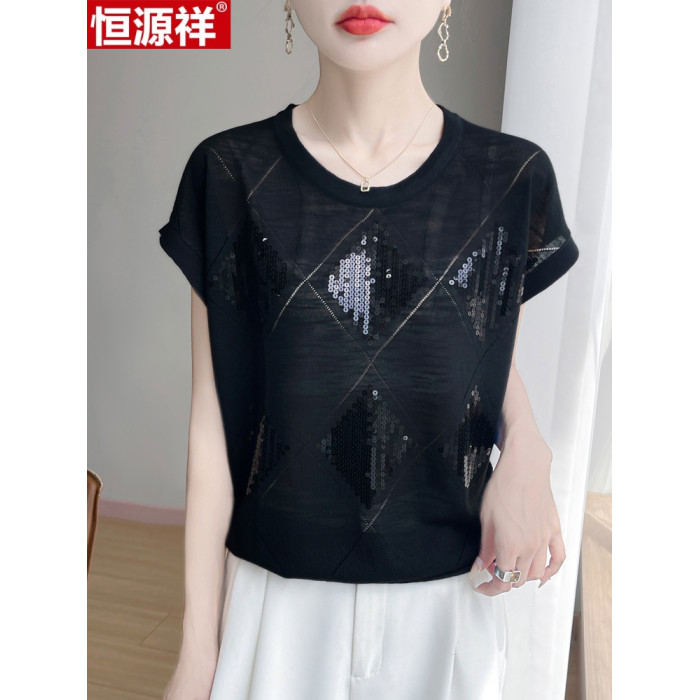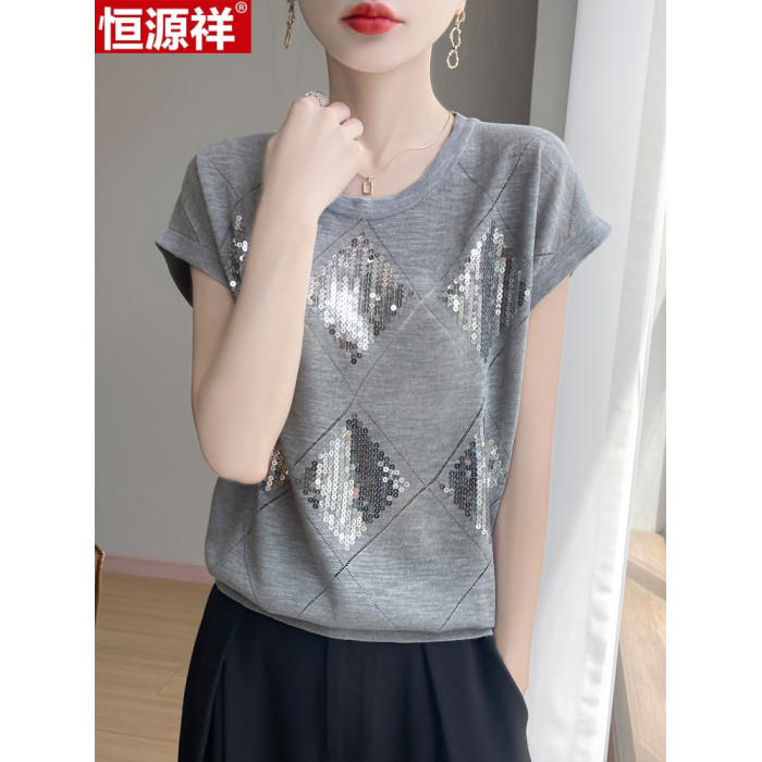 恒源祥桑蠶絲短袖女T恤夏季新款寬松圓領針織衫上衣亮片真絲短袖