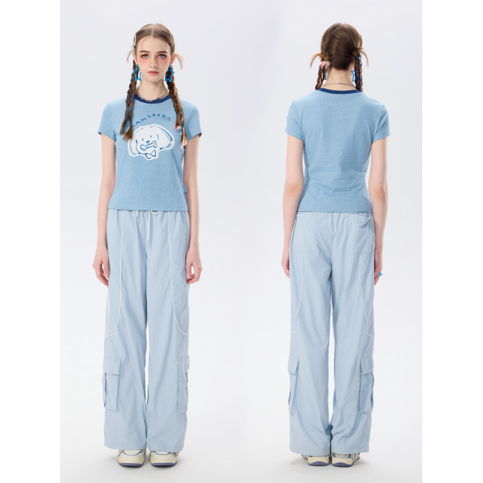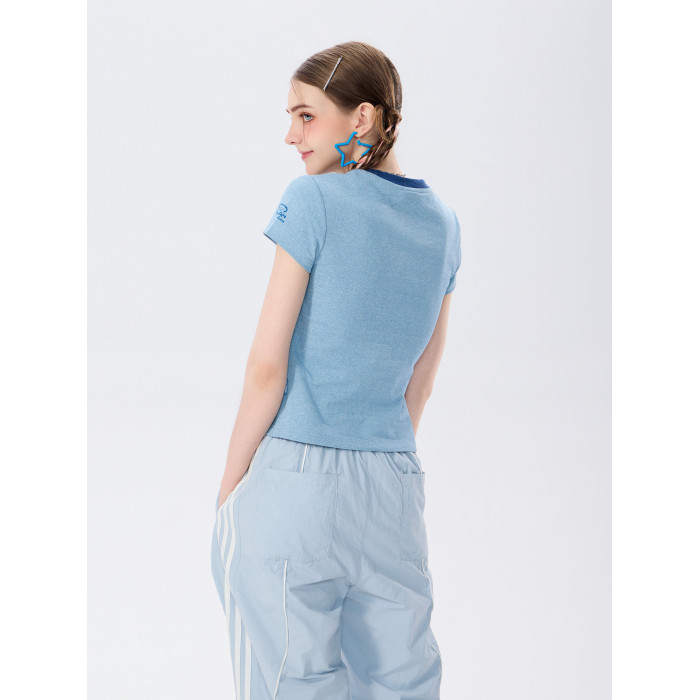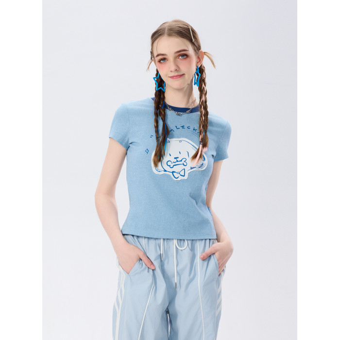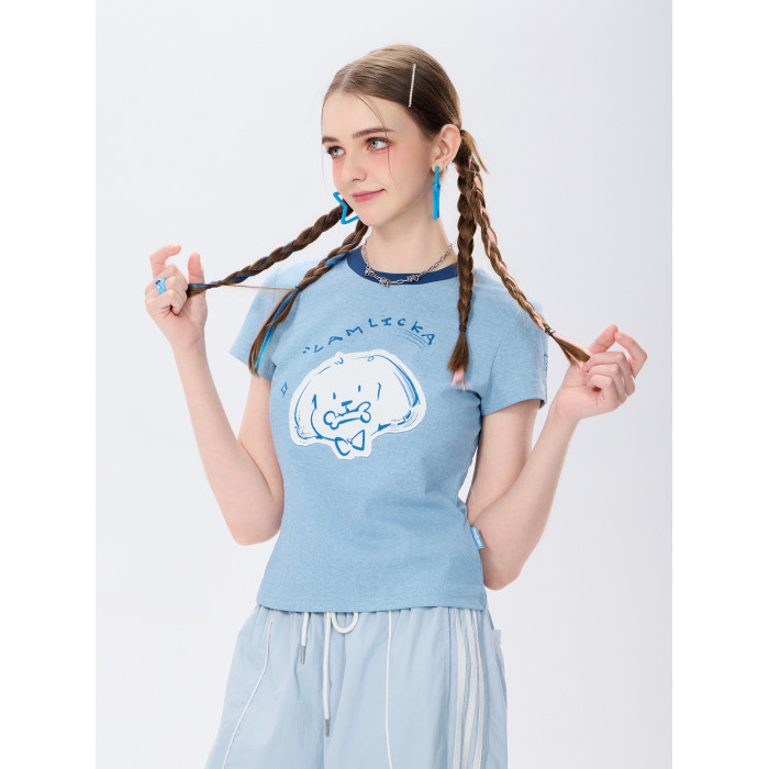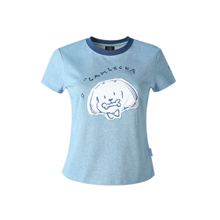 LAMLICKA小狗貼布藍色短袖修身顯瘦短款上衣設計感百搭正肩女t恤