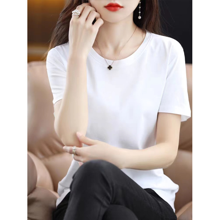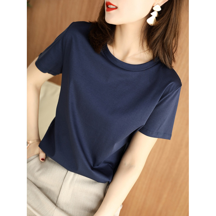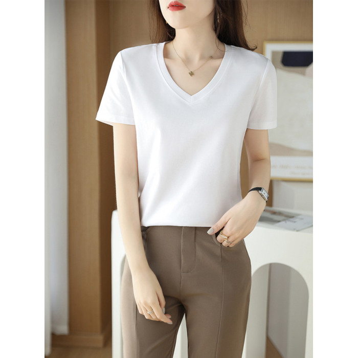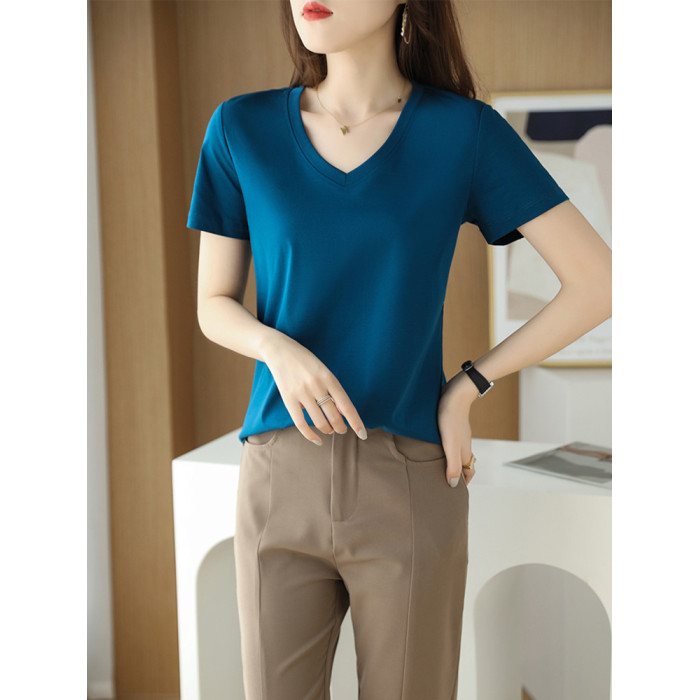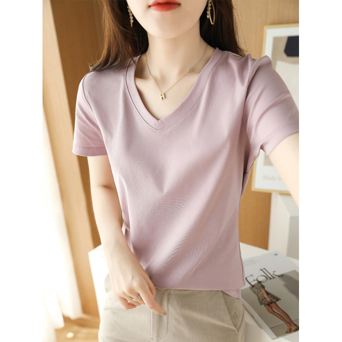 2025年夏季v領高密80支絲光棉短袖女t恤涼感舒適寬松顯瘦純棉上衣