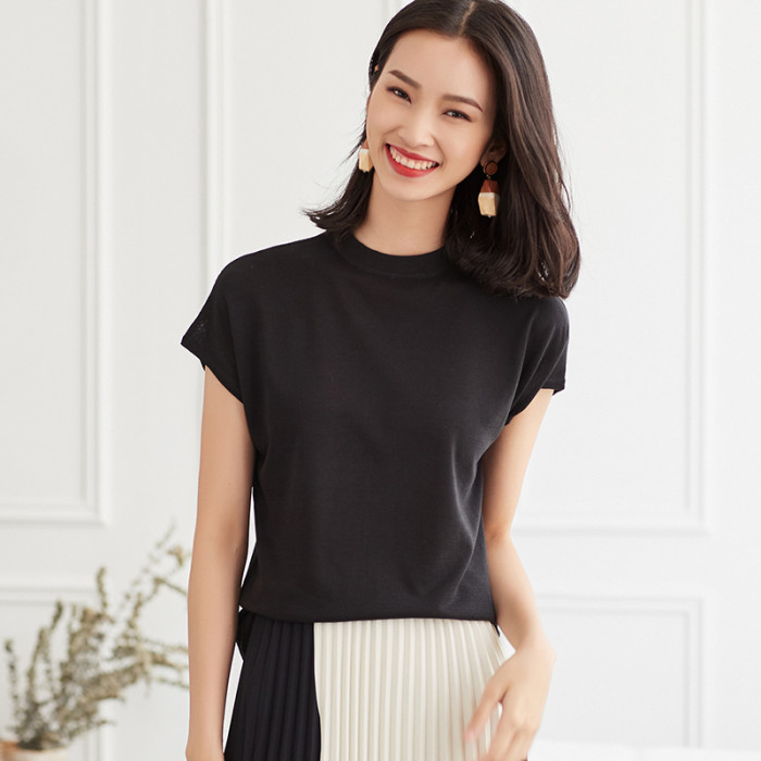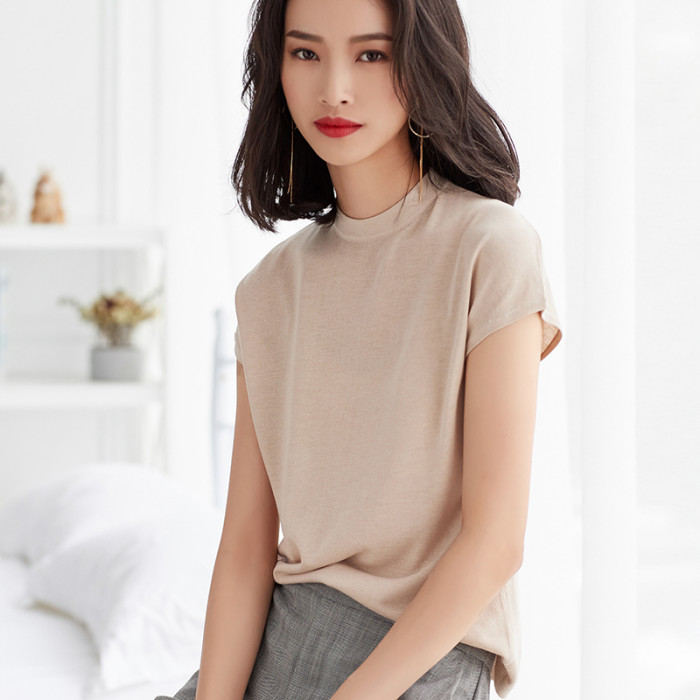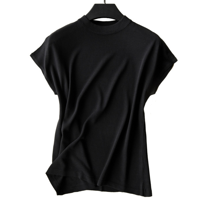 天絲亞麻半高領無袖針織衫女T恤寬松新款圓領冰絲短袖坎肩上衣夏