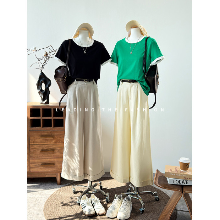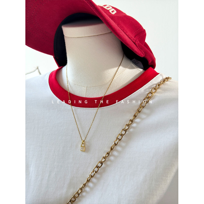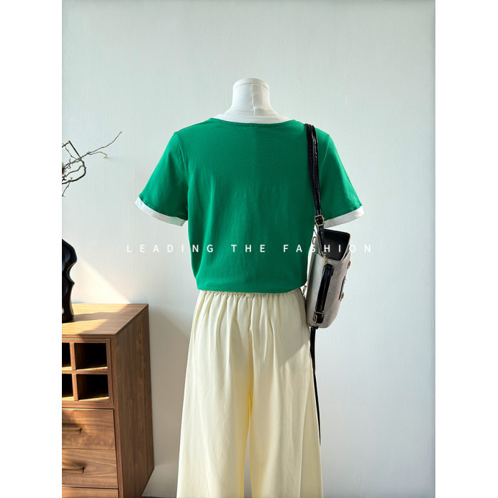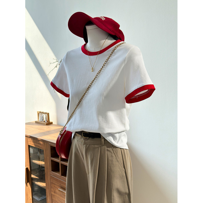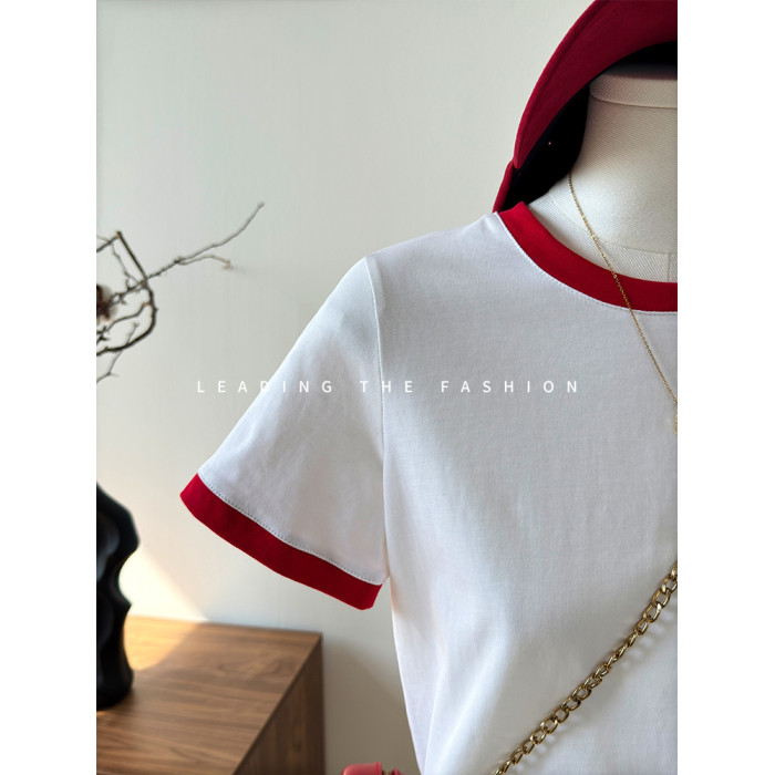 精梳純棉 撞色短袖女t恤夏 紅色領口白體恤休閒寬松圓領正肩上衣