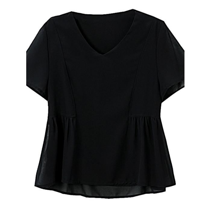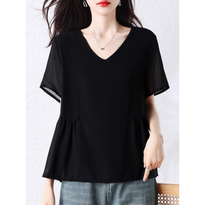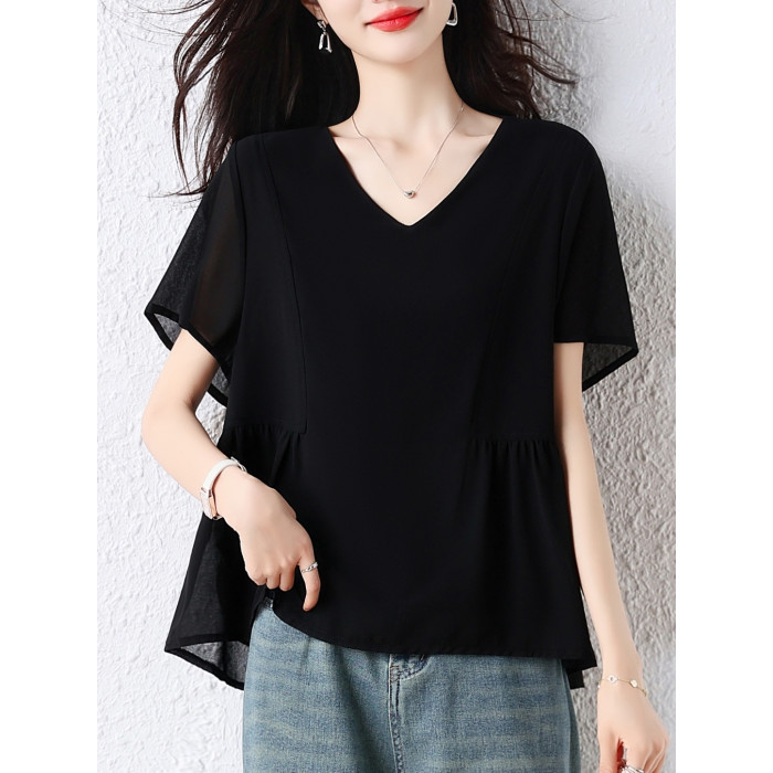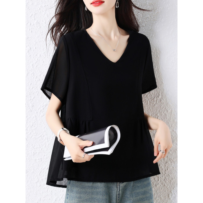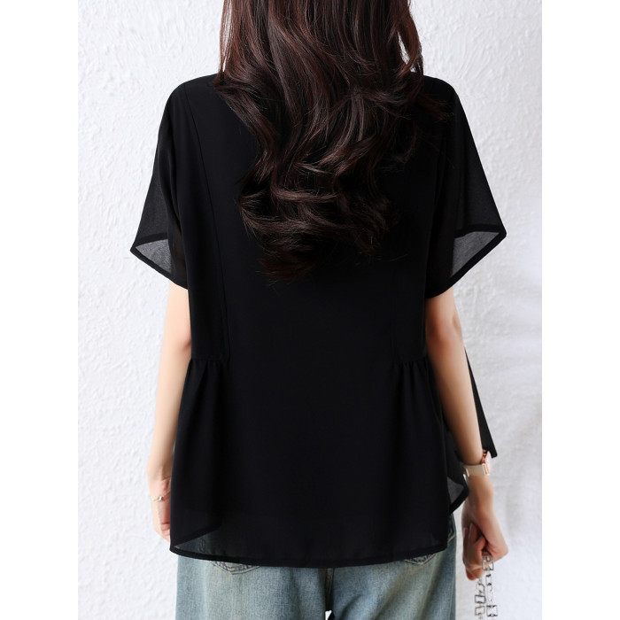 素木捏褶設計感黑色短袖女t恤2025夏季新款微胖減齡雪紡氣質上衣
