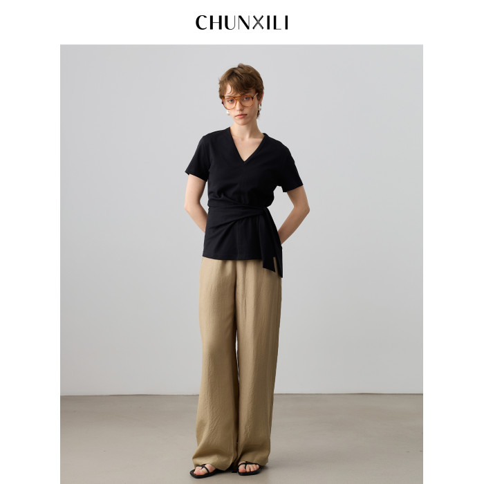 chunxili/春熙裡 女士小衫短袖V領 純色不規則棉+桑蠶絲舒適女T恤