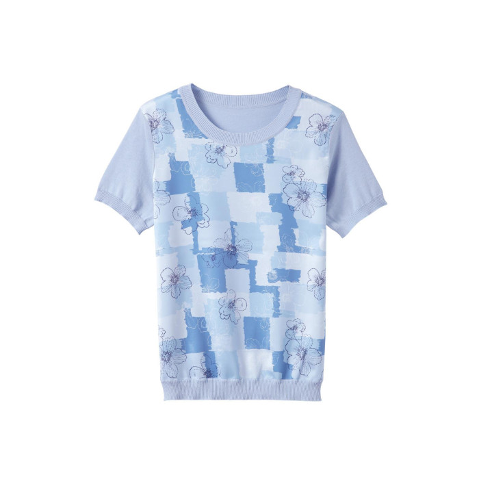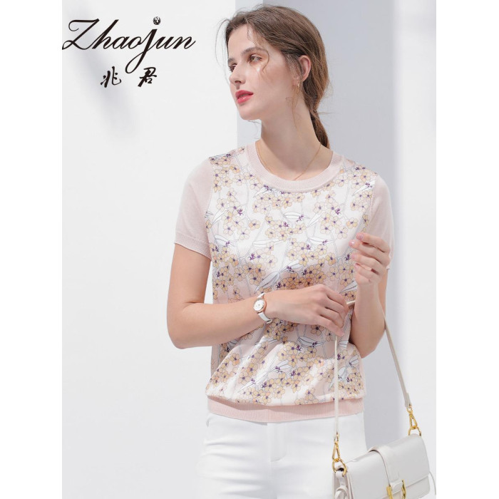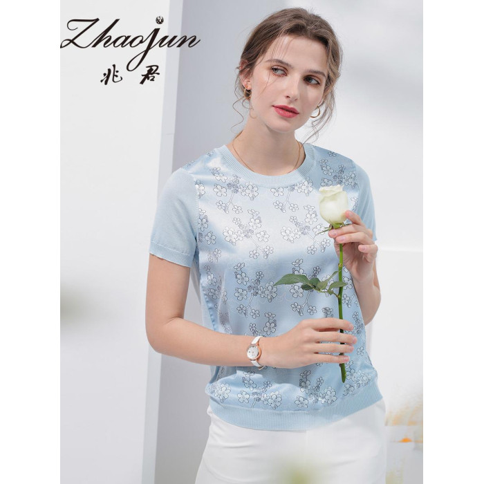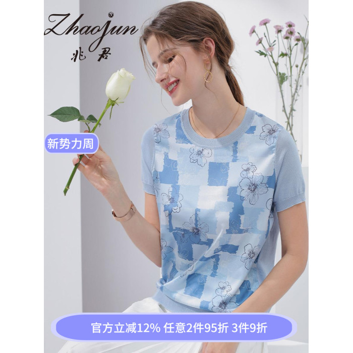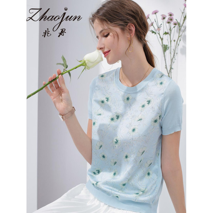 兆君 田園碎花桑蠶絲圓領女T恤秋季女式針織衫短袖T恤