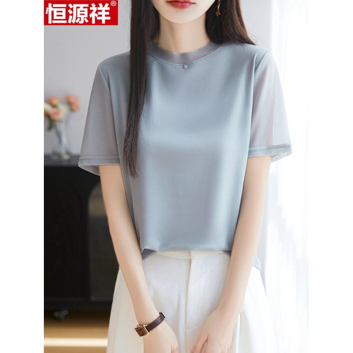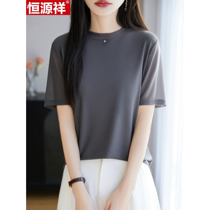 恒源祥桑蠶絲短袖女T恤夏季新款寬松圓領針織衫上衣網紗真絲短袖