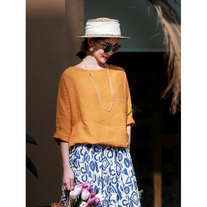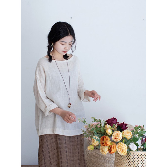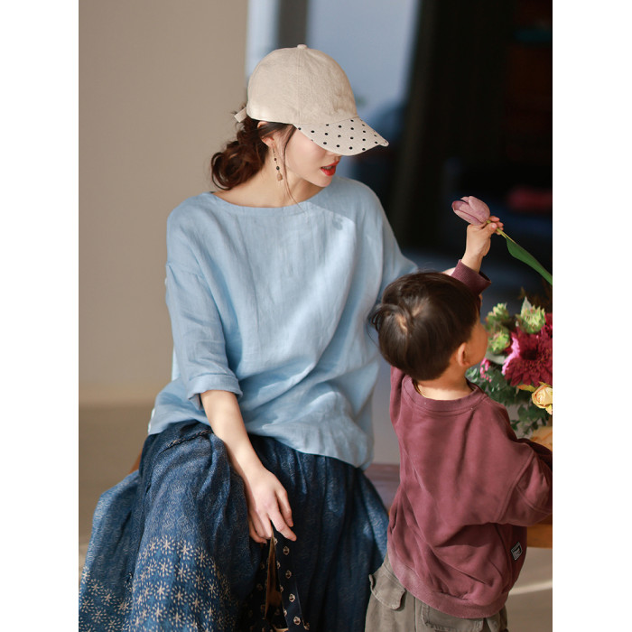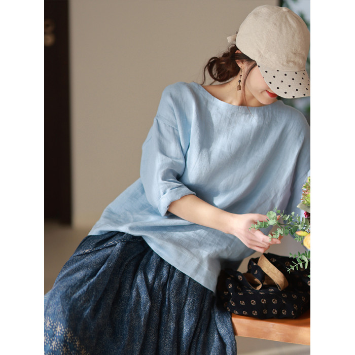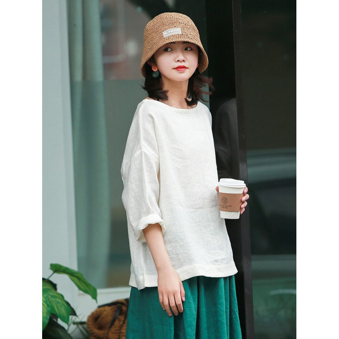 墨黛原創[銀河]2024夏石磨洗亞麻白色上衣一字領寬松顯瘦女T恤