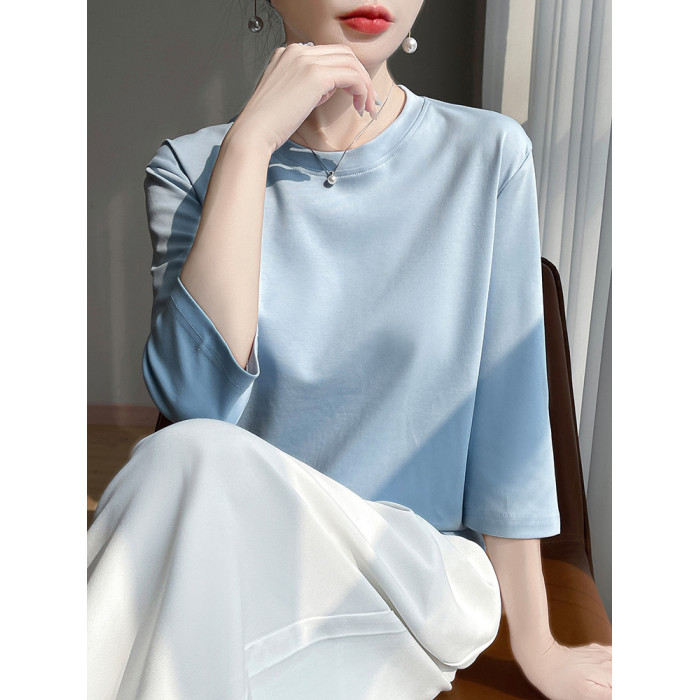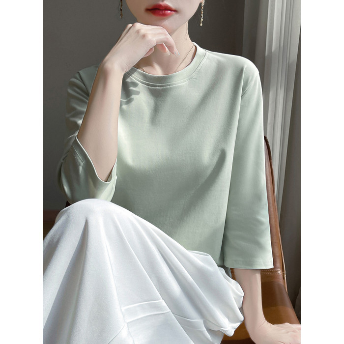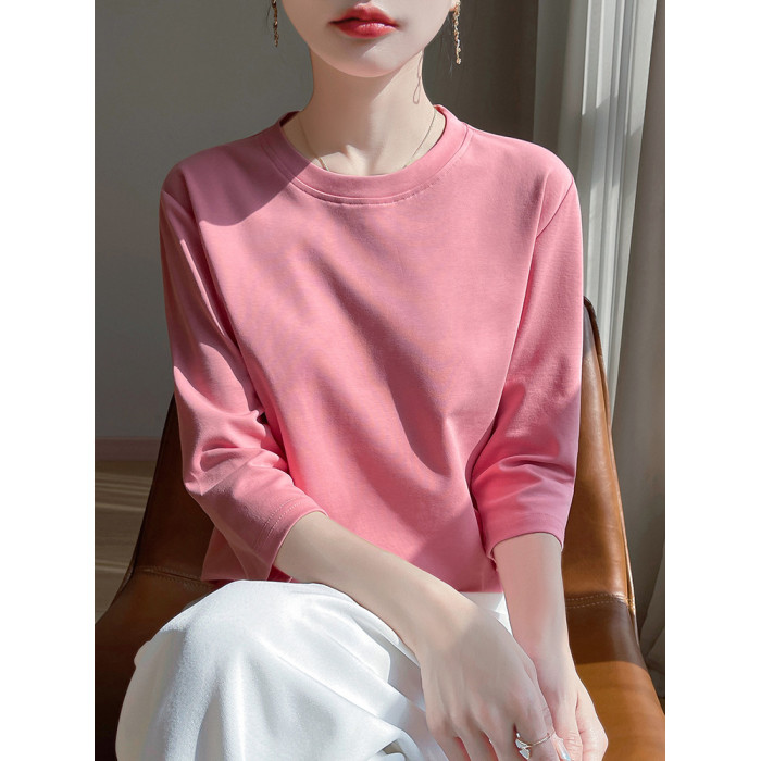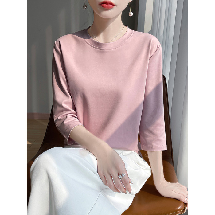 七分袖女t恤純棉中袖新款春秋季圓領寬松休閒打底衫半袖正肩高級