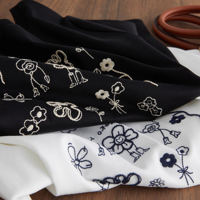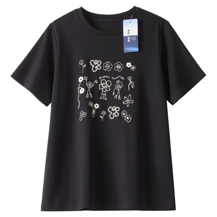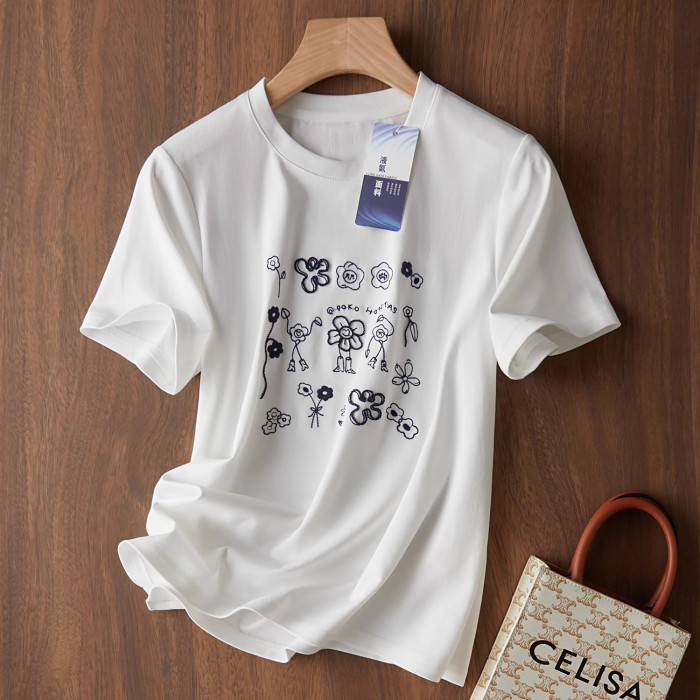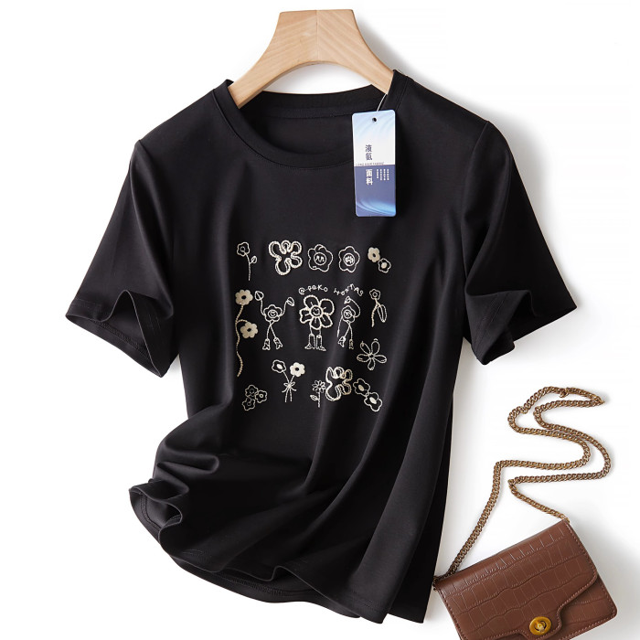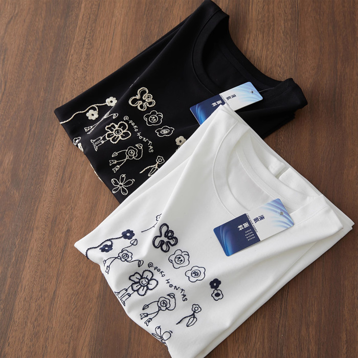 液氨棉立體刺綉正肩女t恤短袖2025超火減齡上衣夏季圓領休閒體恤