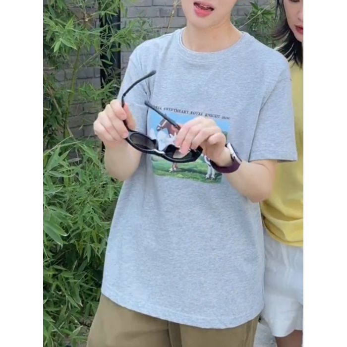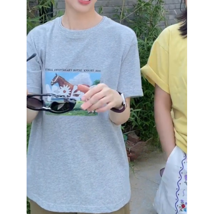 灰色小馬印花短袖女t恤2025新款寬松顯瘦設計感美式復古氣質上衣