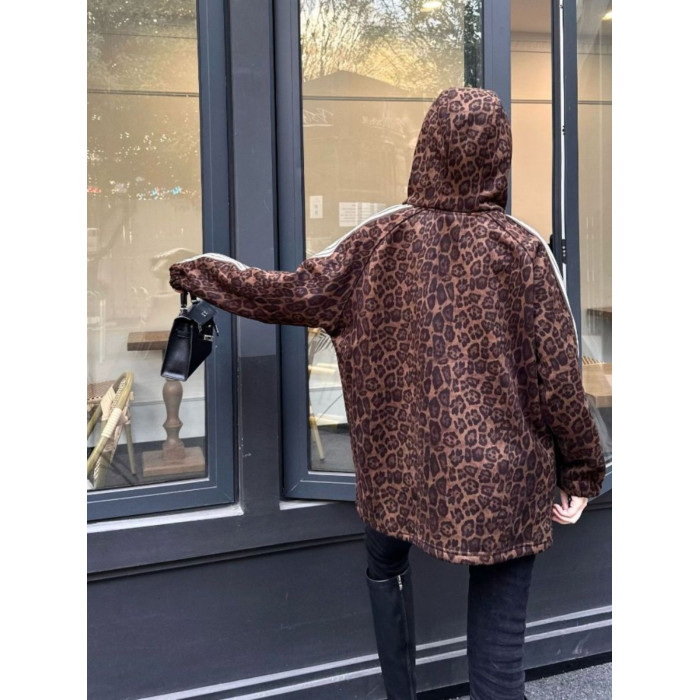 時尚寬松保暖豹紋中長款衛衣女2025春秋款洋氣韓版連帽百搭上衣女