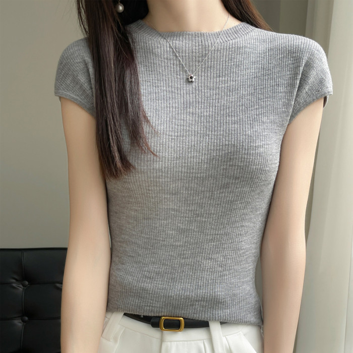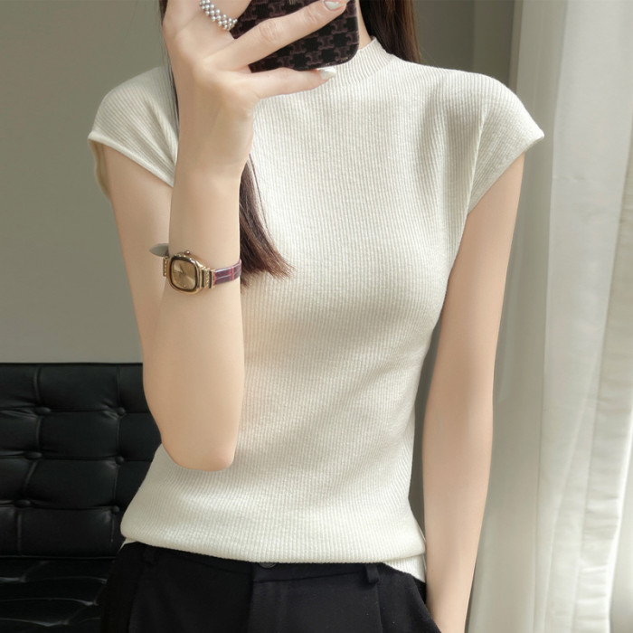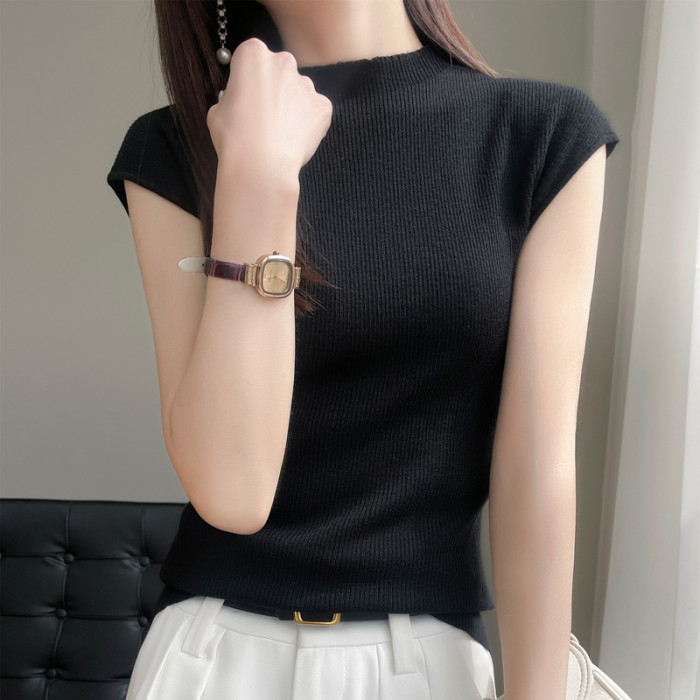 冰絲半高領螺紋針織衫女T恤2025夏修身百搭打底上衣短袖薄款半袖