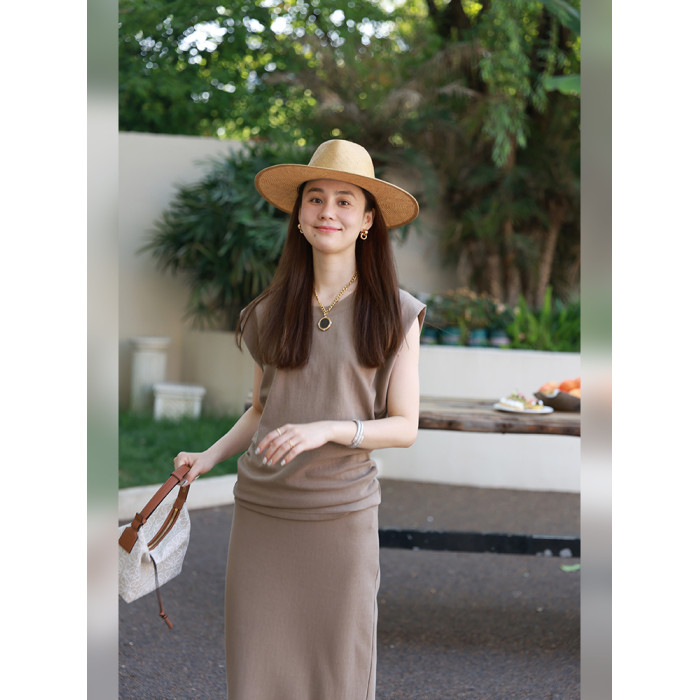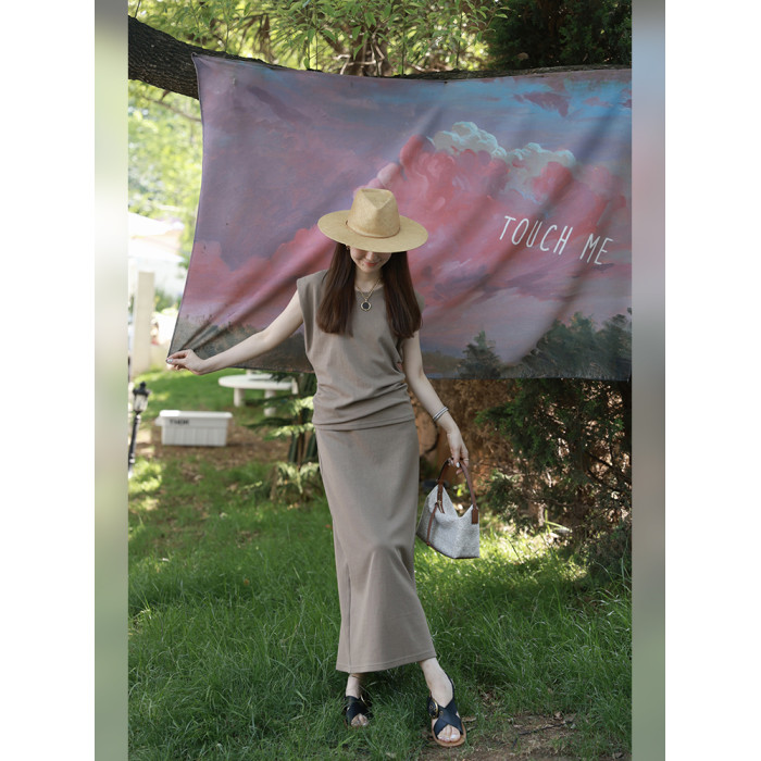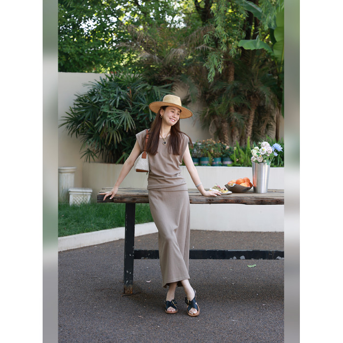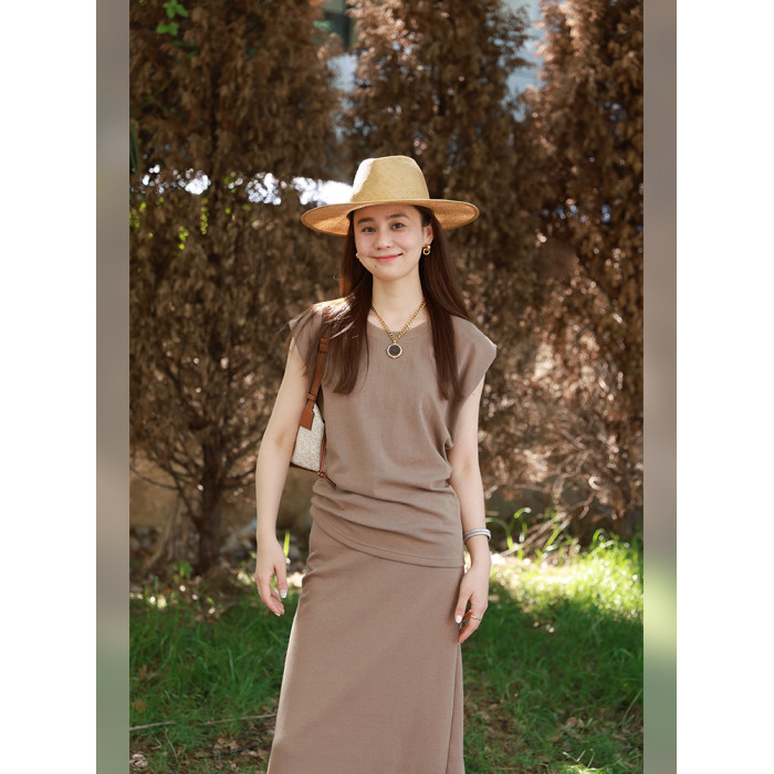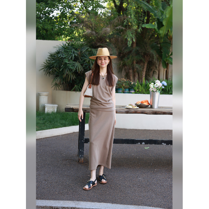 WinnieTang超薄垂感極簡休閒衛衣套裝 墊肩無袖背心+松緊腰半身裙