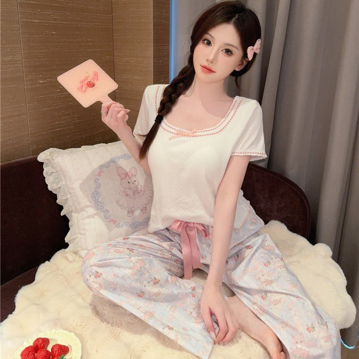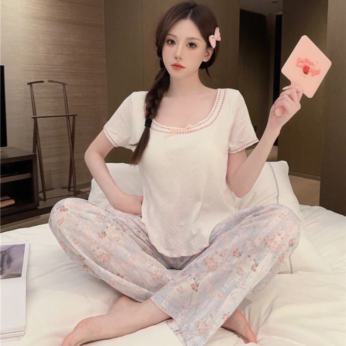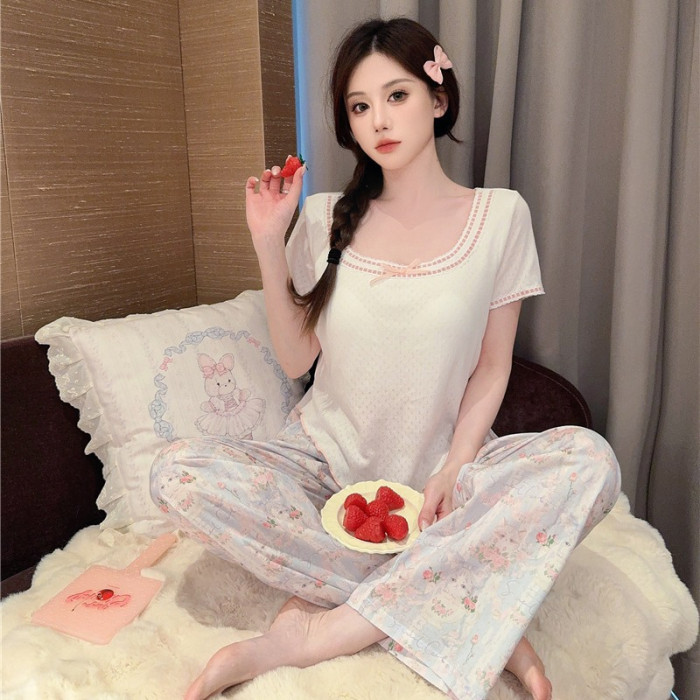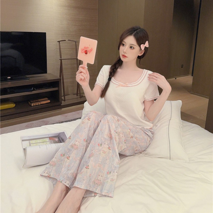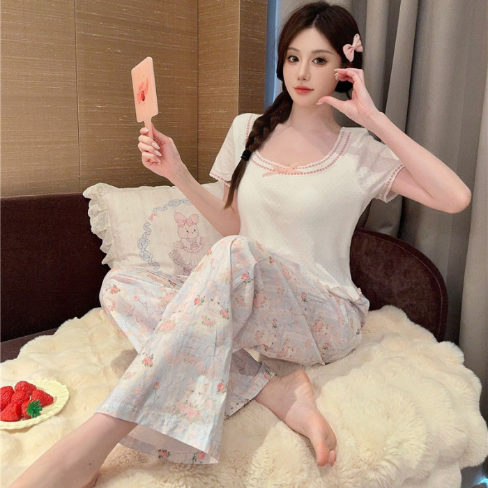 睡衣女夏季梭織棉提花貓咪印花針織上衣舒適短袖長褲套裝家居服